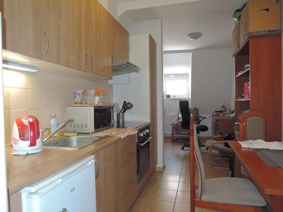 Kuchyně je zařízená spotřebiči včetně ledničky. Jinak bez nábytku. V domě je k dispozici výtah.