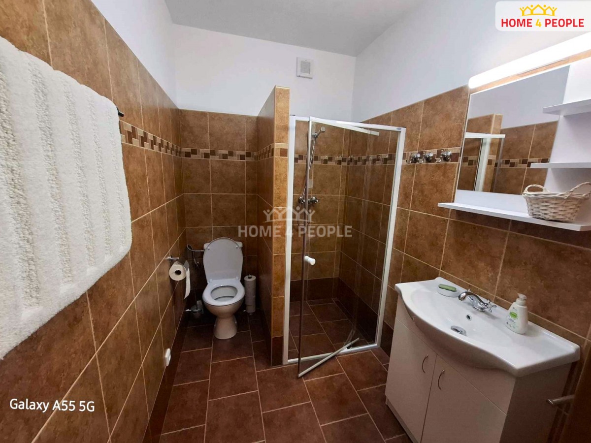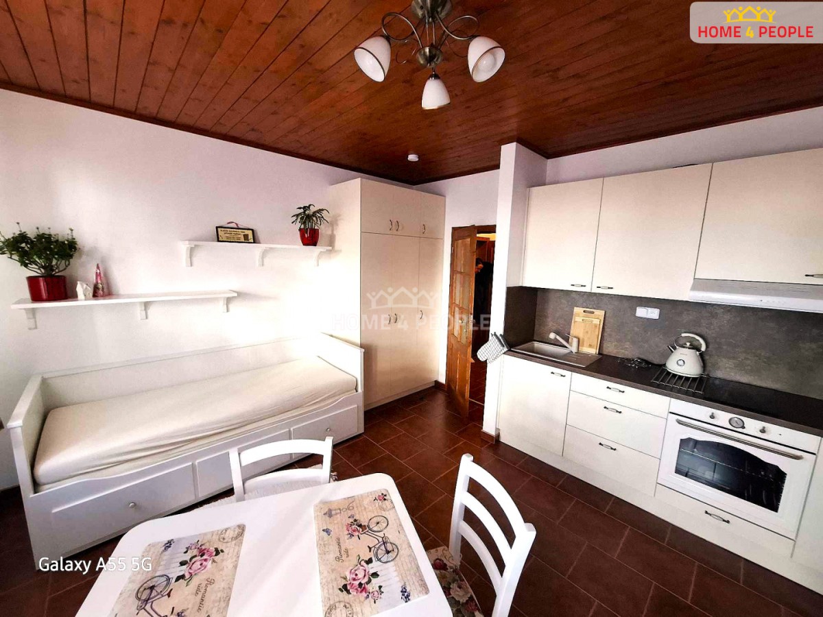 Byt se nachází v přízemí výměrou 23 m² je kompletně vybavený , ...v hlavní místnosti o výměře 16 m² je kuchyňská linka na míru se všemi potřebnými spotřebiči, rozkládací postel, úložná skříň a jídelní stůl pod okny do ulice.