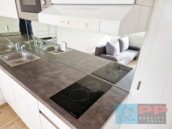 ...Byt je zařízen, je tam kuchyňská linka s vestavěnou malou ledničkou, mikrovlnnou troubou, digestoří, sklokeramickou varnou deskou, rozkládací pohovka a šatní skříní. V koupelně je sprchový kout, umyvadlo a sociální zařízení WC.