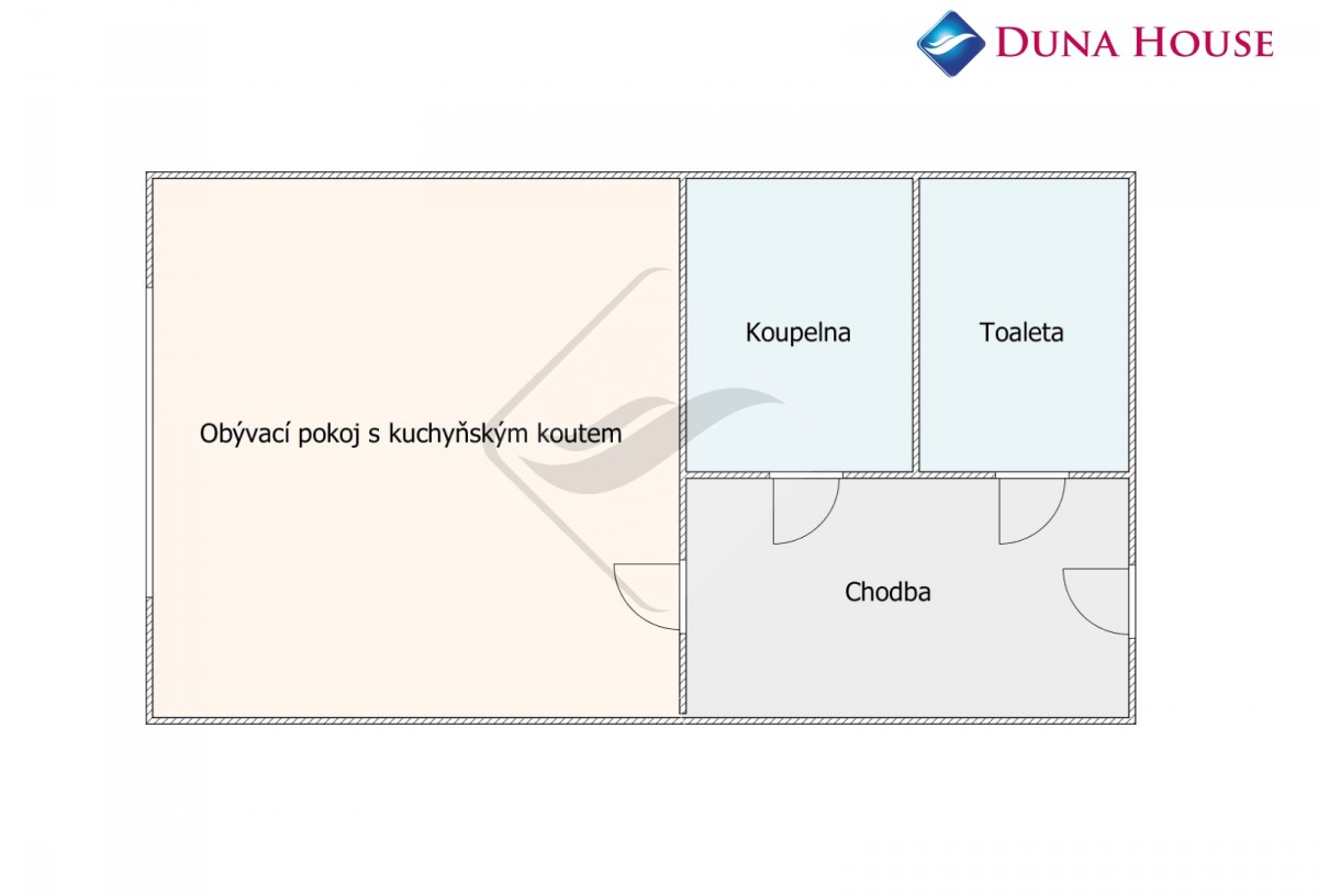 Dispozice bytu je tvořena chodbou, ... pokojem s kuchyňským koutem s místem na pračku, koupelnou se sprchovým koutem a samostatnou toaletou.