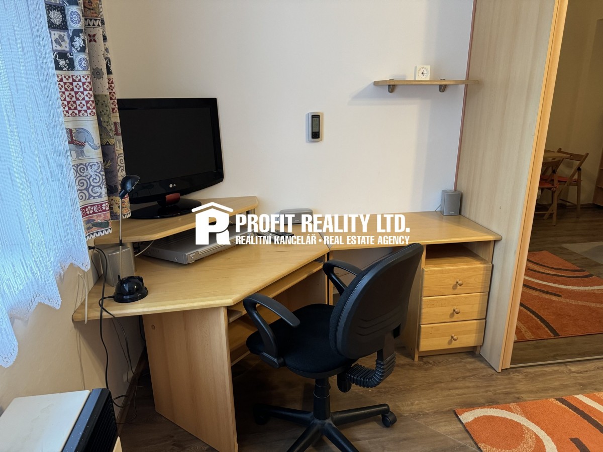Dispozice bytu: obývací pokoj s kuchyňským koutem. Kuchyně je vybavena lednicí s mrazákem, značkovou plynovou varnou deskou, mikrovlnkou, dále jídelní stolek se židlemi, pracovní stůl, skříně s velice praktickým vestavěným rozkládatelným žehlícím prknem a postel bez matrace. Vytápění plynovým topným topením WAV s pravidelný ročními kontrolami a servisem, plovoucí podlahy, nové plastové okno.