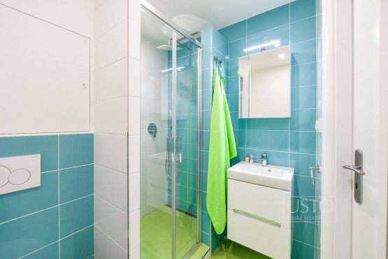 Koupelna: Sprchový kout, umyvadlo, sociální zařízení WC, pračka