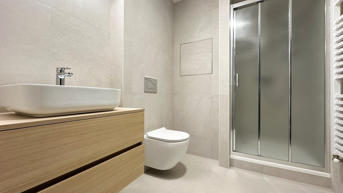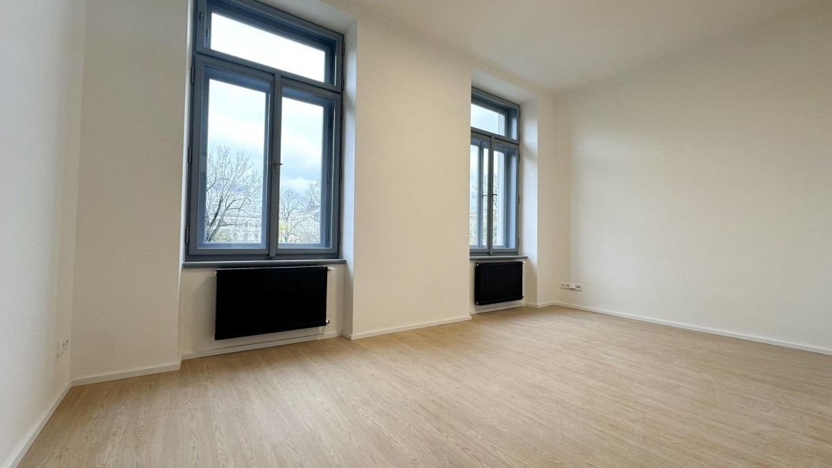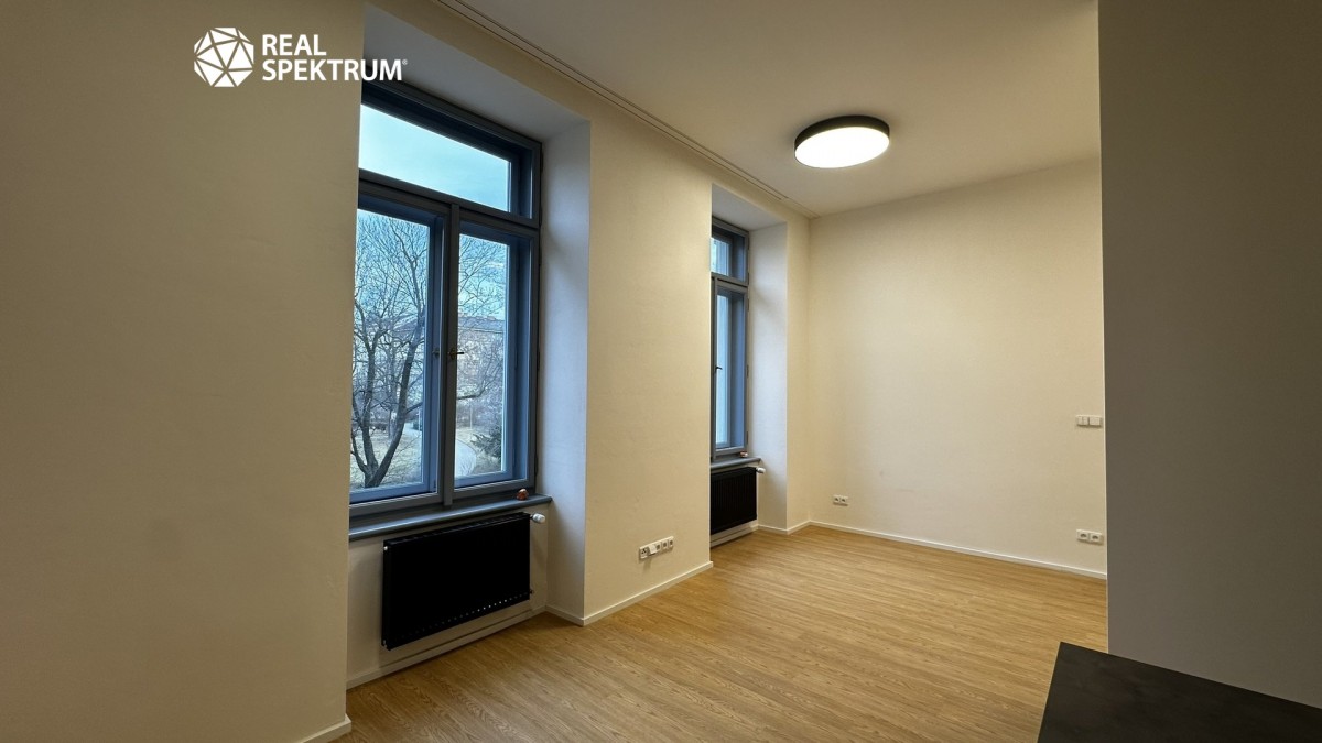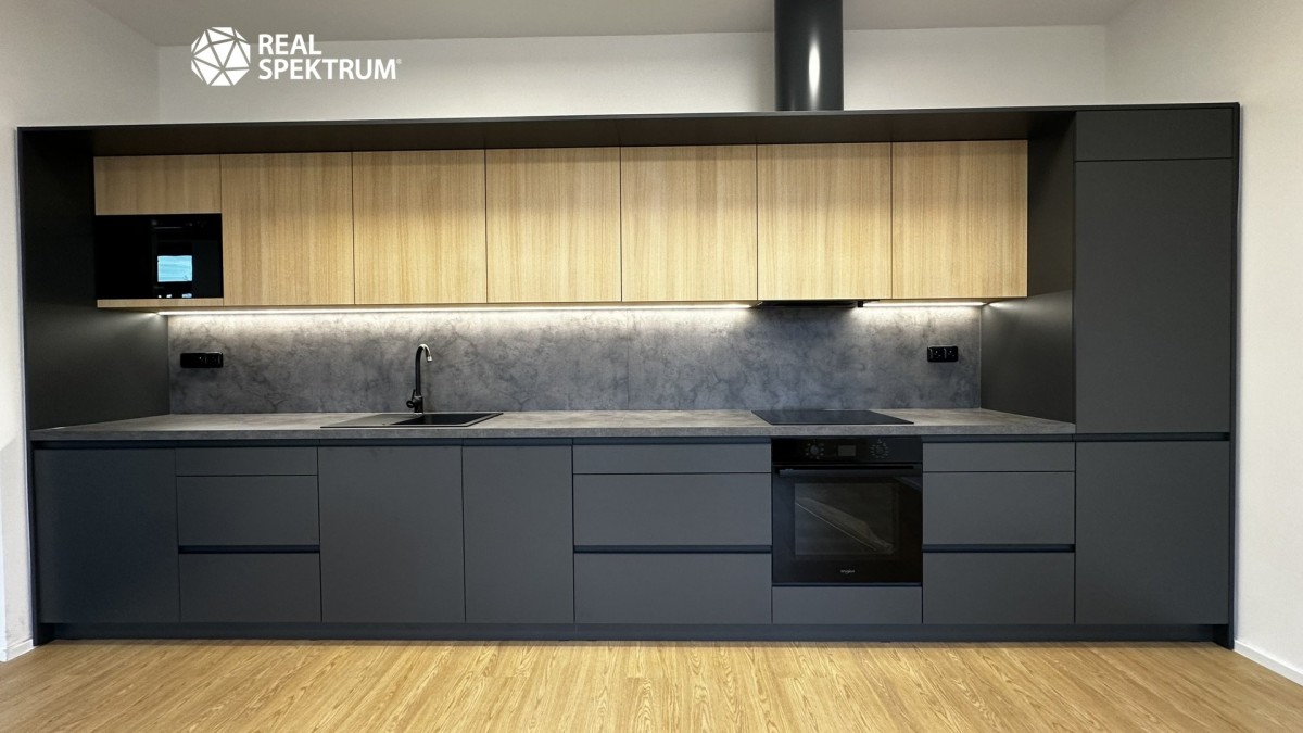Apartmán se pronajímá částečně vybavený – k dispozici je nová kuchyňská linka s elegantní kombinací černé a dřeva, včetně spotřebičů (myčka, lednice, varná deska, trouba, mikrovlnka). Obytný prostor působí vzdušně díky vysokým oknům a světlým podlahám. Koupelna je moderní a prostorná – sprchový kout, umyvadlová skříňka, toaleta a pračka.
