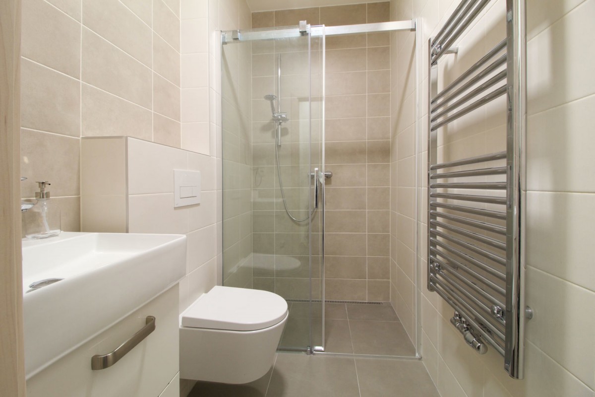 V koupelně je umístěn nadstandardní sprchový kout, sociální zařízení WC a umyvadlo se skříňkou. Výhodou je topný žebřík.