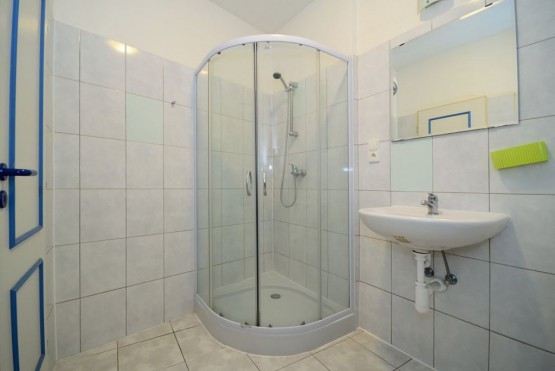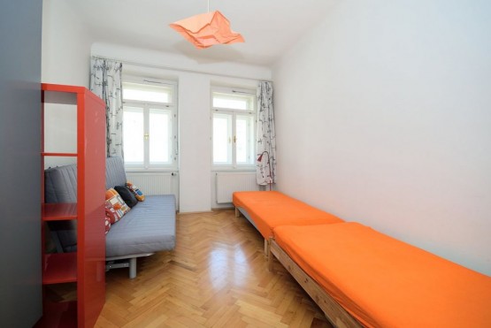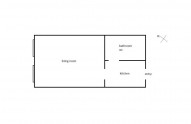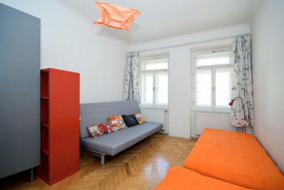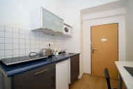 Krásná zařízená garsoniera po rekonstrukci se nachází ve druhém patře cihlového domu bez výtahu v ulici Kateřinská. V pokoji je postel, psací stůl a knihovna.