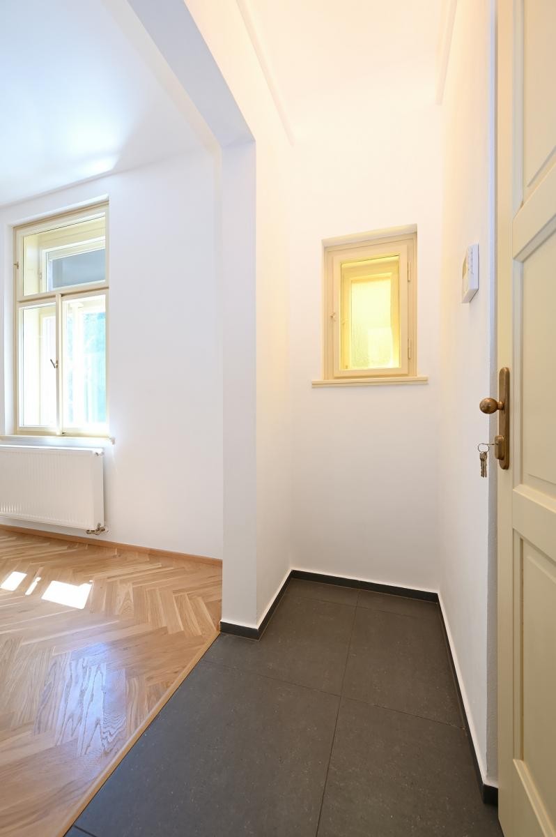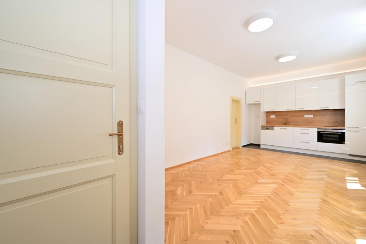 Bydlení s ná...dechem romantiky první republiky v historickém kontextu lokality. Velmi zdařilá rekonstrukce činžovního domu, v každém bytě citlivá kombinace renovovaných původních prvků s moderním vybavením kuchyně a koupelny. Plně vybavená kuchyně, nový kondenzační plynový kotel se zásobníkem TUV. Možné dovybavit vestavěnou skříní a pračkou. Krásná dřevěná podlaha, kvalitní kuchyňská linka se spotřebiči AEG, lednice, mrazák, indukční dvojvařič, kombi trouba s možností pečení a mikrovlnky. Okna vybavena elektrickými roletami. K dispozici pěkný čistý sklep.