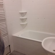 Kuchyňský kout je vybaven moderní linkou s dřezem, dále sporákem a digestoří. V Koupelně je standardní vana, umyvadlo, otopný žebřík a kout s toaletou.