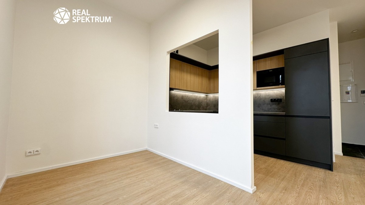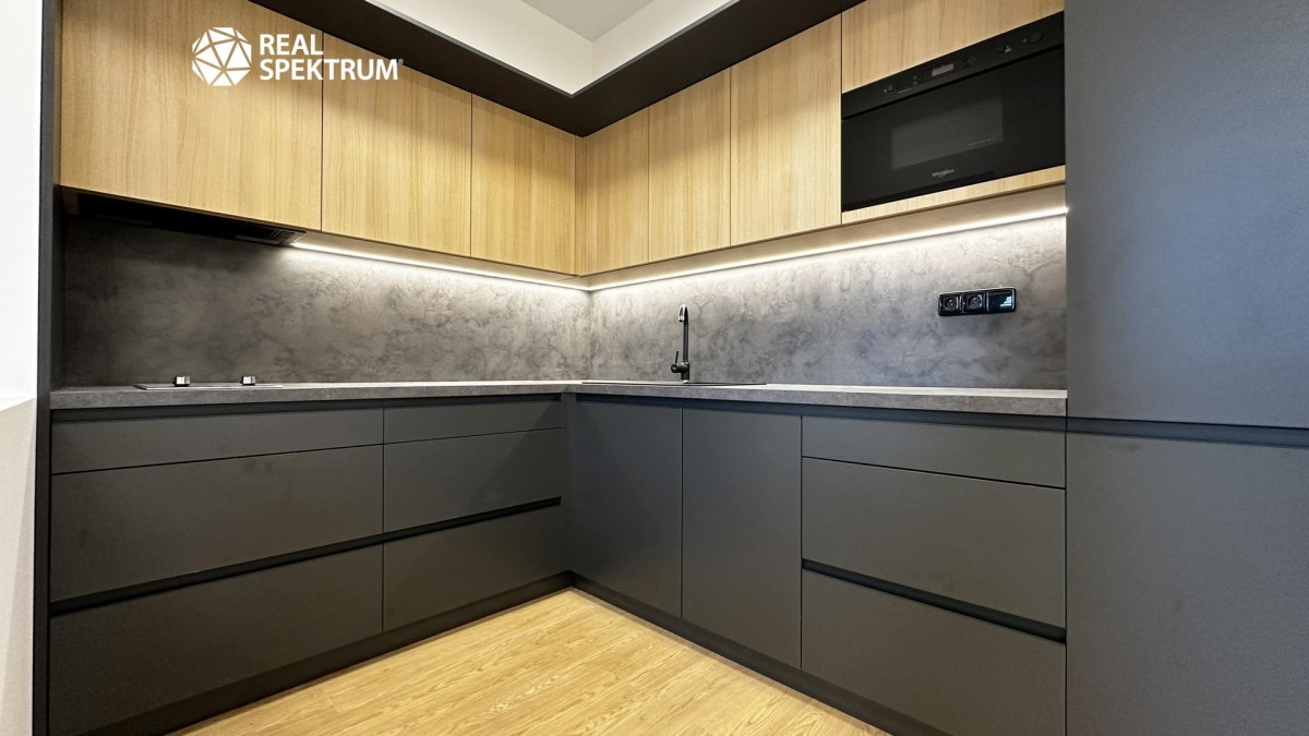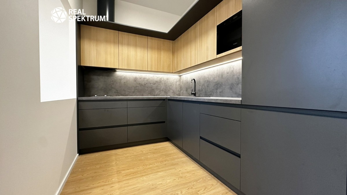 Apartmán se pronajímá částečně vybavený – k dispozici je nová kuchyňská linka s elegantní kombinací černé a dřeva, včetně spotřebičů (myčka, lednice, varná deska, trouba, mikrovlnka). Obytný prostor působí vzdušně díky vysokým oknům a světlým podlahám.