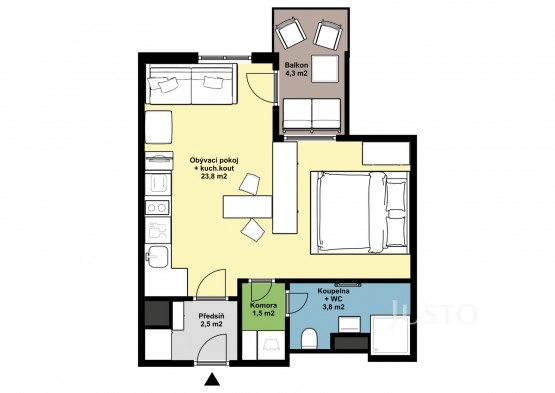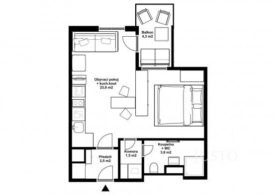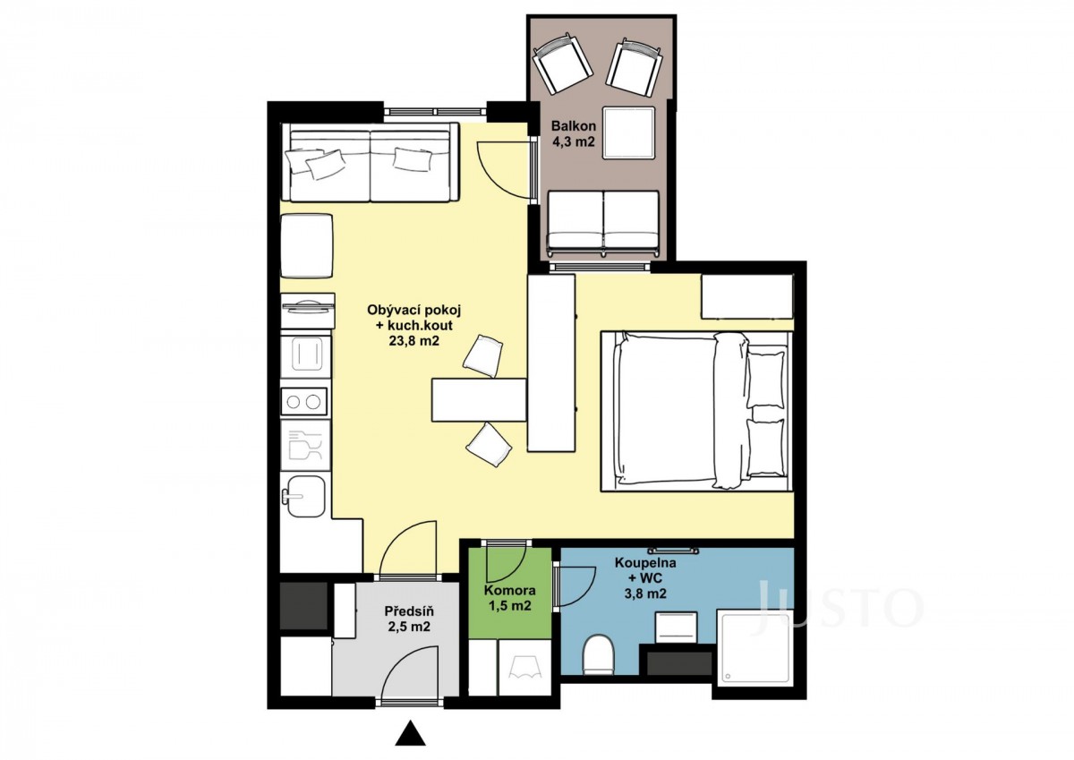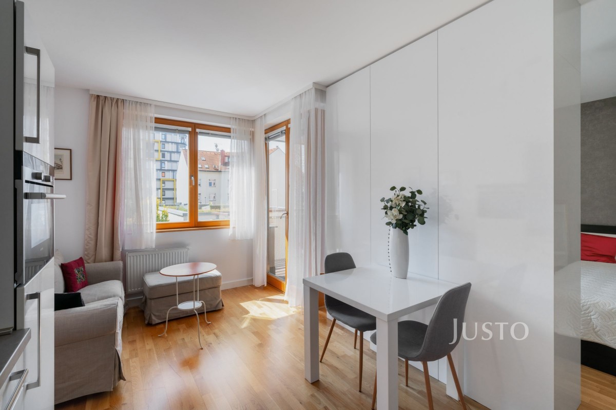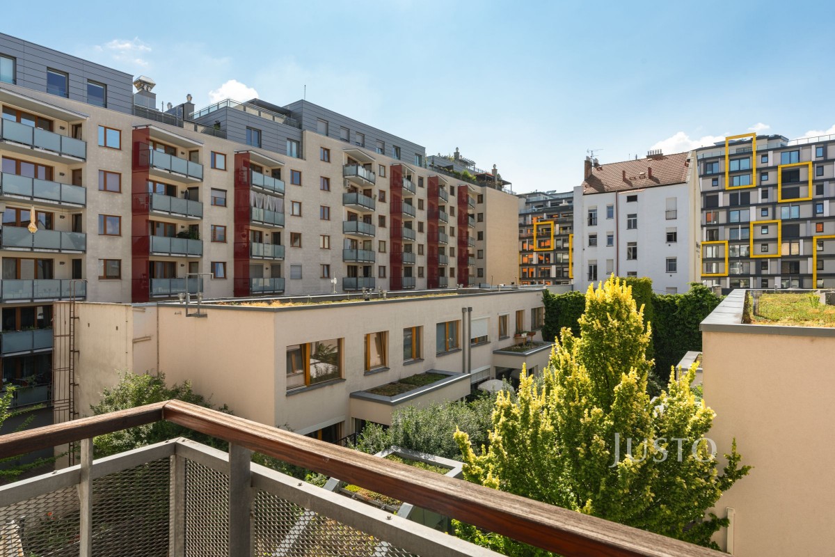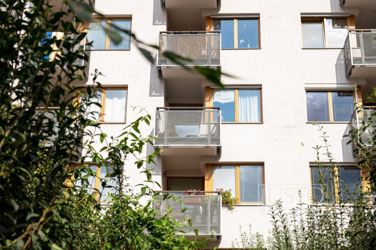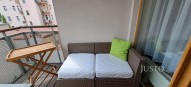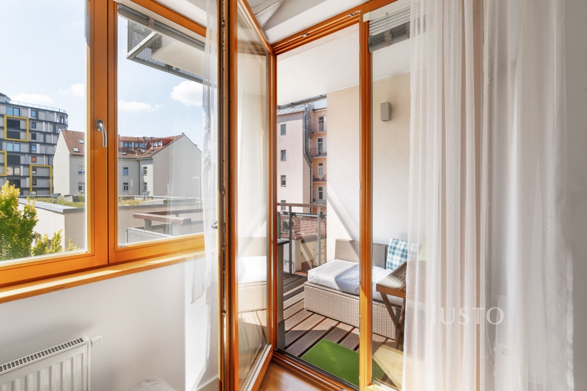 Na balkóně orientovaném na jižní stranu s výhledem do zeleného vnitrobloku se pohodlně usadí 4 osoby.