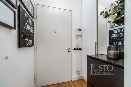 Koupelna je zařízena sprchovým koutem a koupelnovým nábytkem, pračkou Samsung a vestavěnými úložnými prostory. Ty se nacházejí i v předsíni vybavené také botníkem, videotelefonem Bticino a vysoce odolnými vstupními dveřmi.