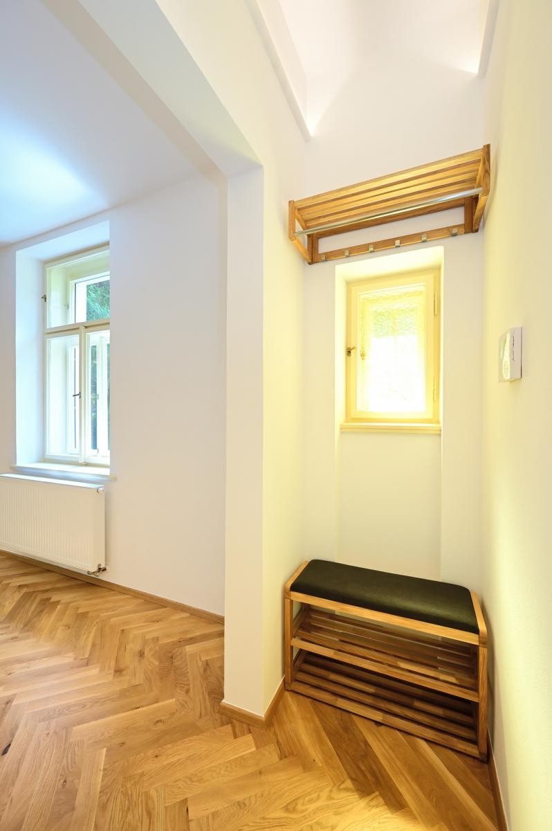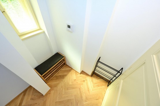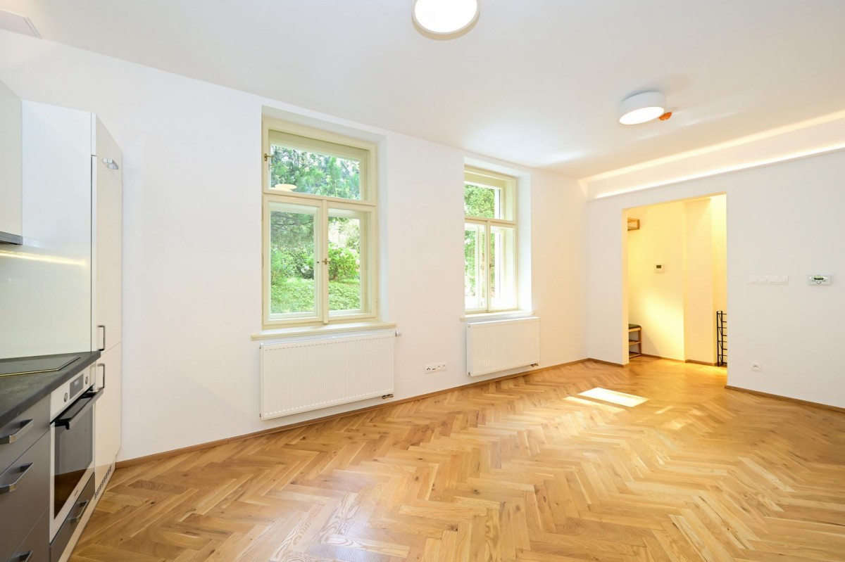 Rekonstrukce bytu 1+kk s jihozápadními okny do zahrady, která je přístupná pro obyvatele domu. Velmi tichý byt, stejně tak se v celém domě dbá na klid.