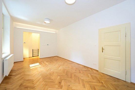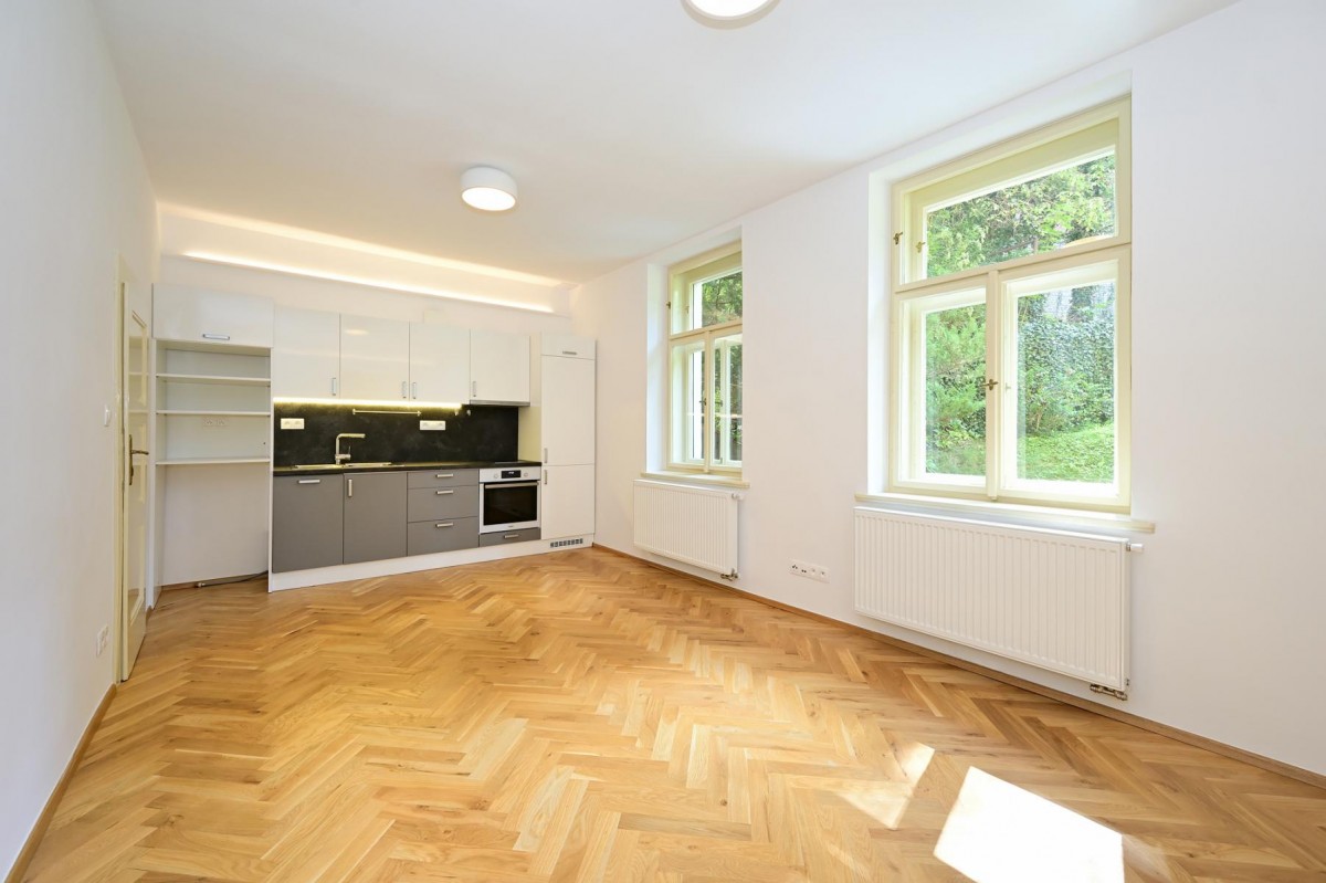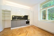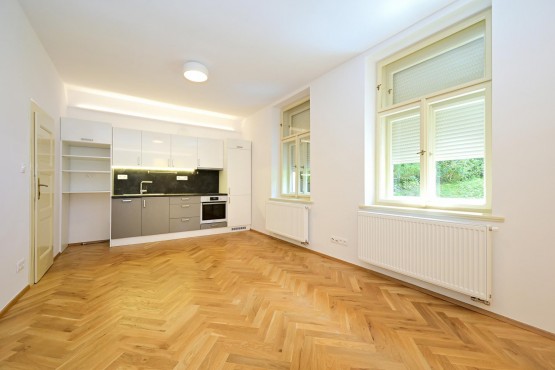 Bydlení s nádechem rom...antiky první republiky v historickém kontextu lokality. Velmi zdařilá rekonstrukce činžovního domu, v každém bytě citlivá kombinace renovovaných původních prvků s moderním vybavením kuchyně a koupelny. Plně vybavená kuchyně, nový kondenzační plynový kotel se zásobníkem TUV. Možné dovybavit vestavěnou skříní a pračkou. Krásná dřevěná podlaha, kvalitní kuchyňská linka se spotřebiči AEG, lednice, mrazák, indukční dvojvařič, kombi trouba s možností pečení a mikrovlnky. Okna opatřena kovovými bezpečnostními žaluziemi. K dispozici pěkný čistý sklep.