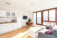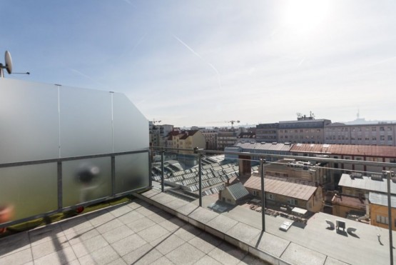 Nabízíme k pronájmu moderní slunný a prostorný  byt 1+kk (32m2) s terasou (16m2) v 7.  patře novostavby,  v oblíbených Holešovicích (4min chůze metro Holešov...ice,  linka C).  Byt je  zařízen moderním nábytkem.  Dále  plně vybavená kuchyňská linka,  televizor,  pračka.   K bytu patří prostorná,  na JIH orientovaná terasa 16m2 s fantastickým výhledem (od Žižkovské věže až k Hradu).  Přesto,  že se jedná o 1kk,   dispozice bytu je koncipována tak,  že je prostor rozdělen na sekce:  hned u vchodu šatní kout,  v hlavní místnosti spací kout,  kuchyňský kout je také částečně vyčleněn.  V lokalitě Holešovic došlo v poslední době k prudkému rozvoji občanské vybavenosti,  kultury i pracovních příležitostí.  Množství kaváren,  restaurací,  divadel i  hezká promenáda na břehu Vltavy dodává místu atmosféru blízského centra.  Spojení s historickým centrem Prahy MHD je velice rychlé a dostatečně frekventované i v nočních hodinách.  Hned vedle "Výstaviště Praha Holešovice" se můžete vydat na procházku po moc hezkém lesoparku Stromovka.