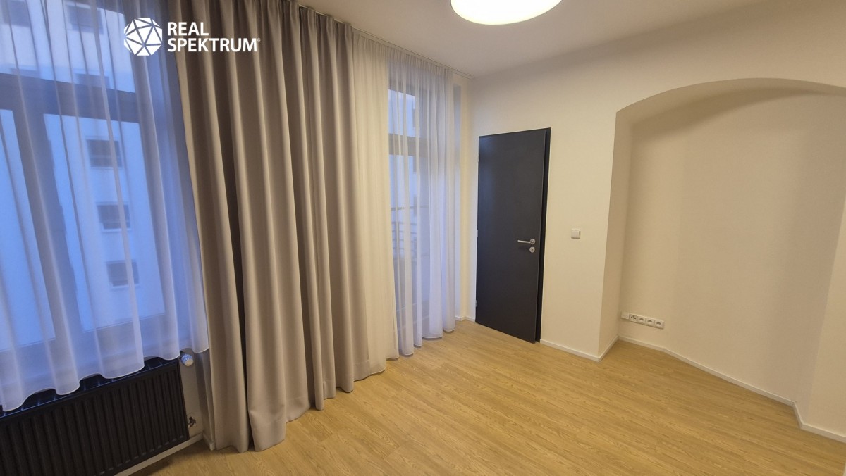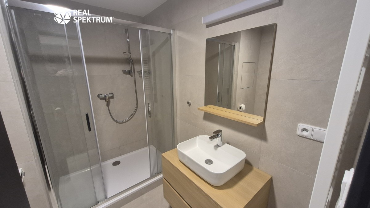 Apartmán se pronajímá částečně vybavený – k dispozici je nová kuchyňská linka s elegantní kombinací černé a dřeva, včetně spotřebičů (myčka, lednice, varná deska, mikrovlnka). Obytný prostor působí vzdušně díky vysokým oknům a světlým podlahám. Koupelna je moderní a prostorná – sprchový kout, umyvadlová skříňka, toaleta a pračka.