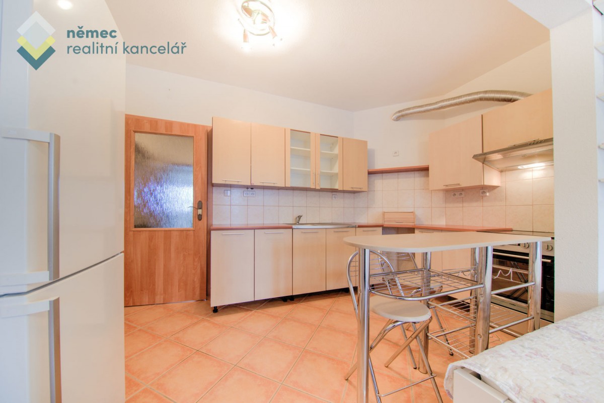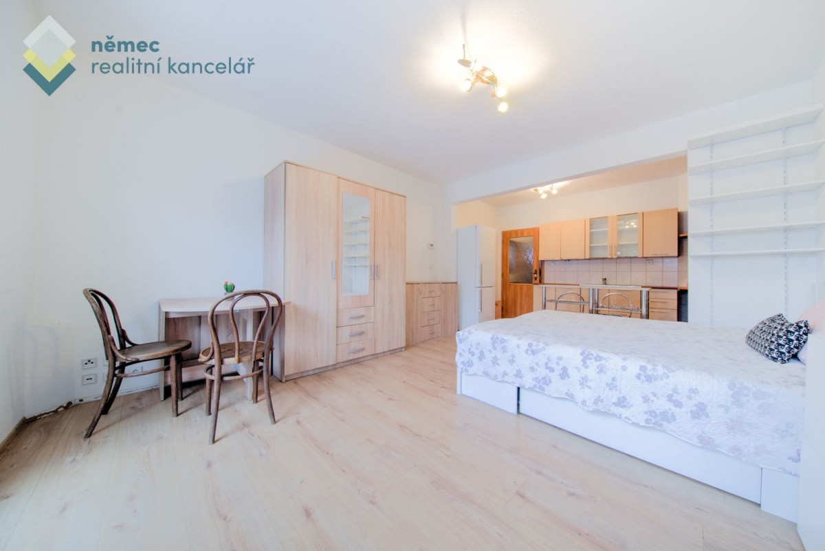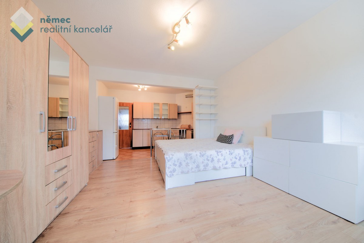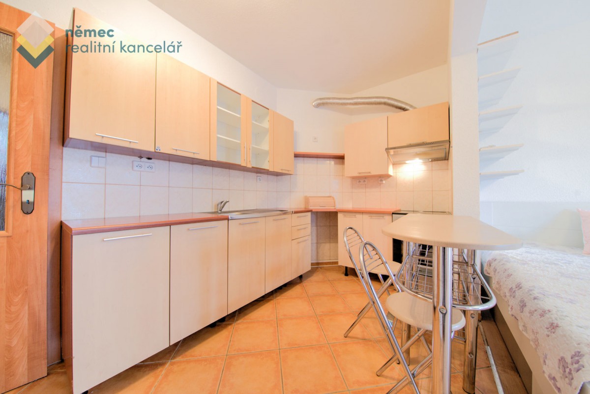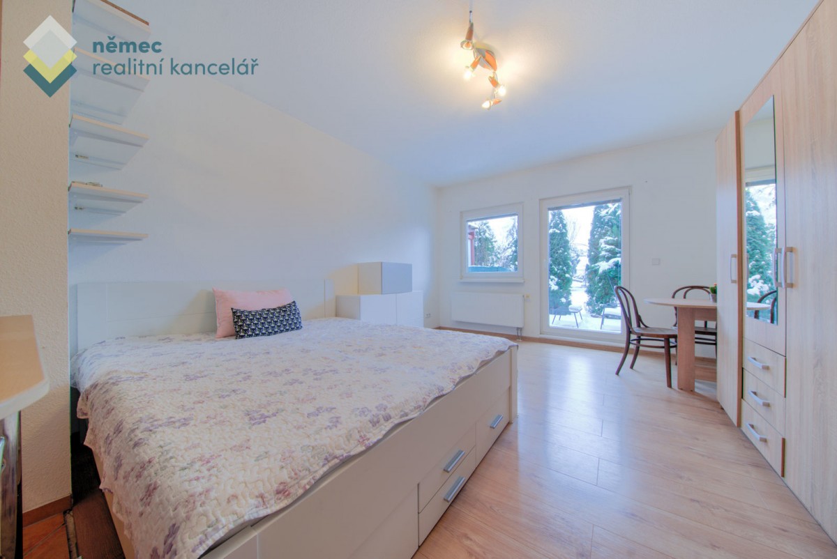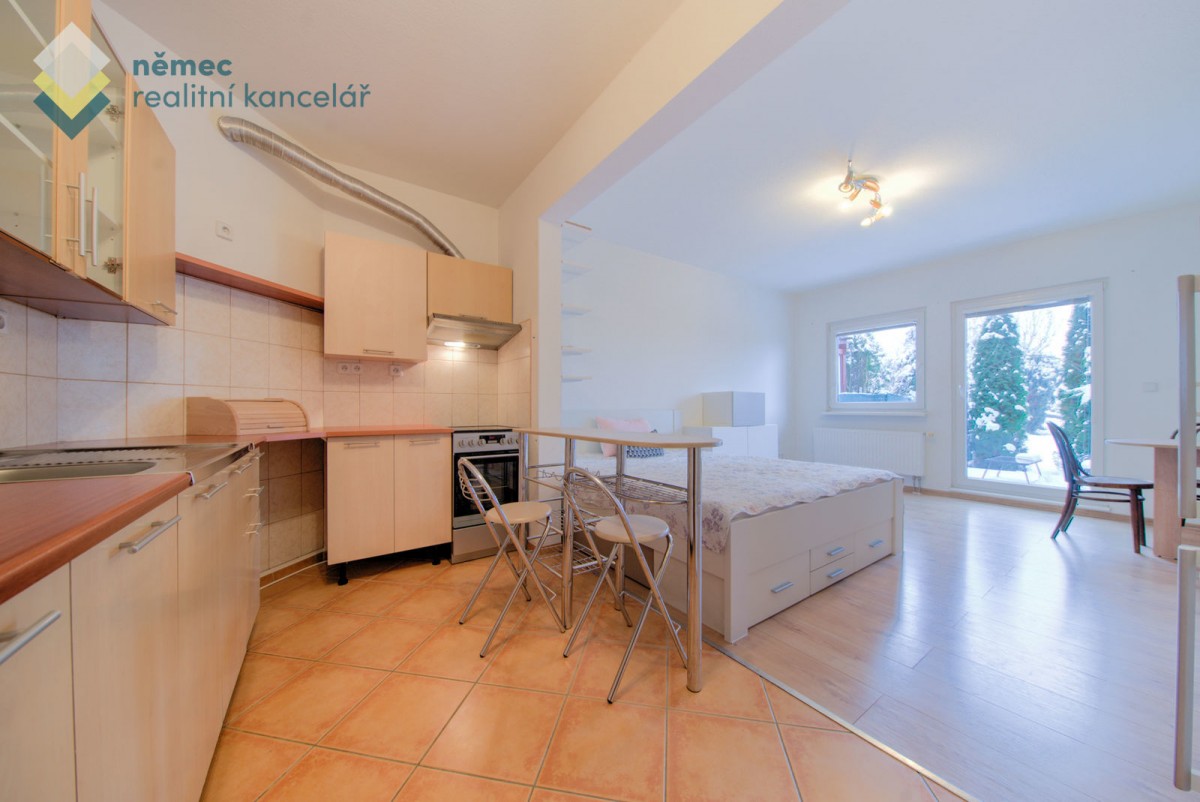 Nábytkem kompletně zařízený byt je dispozičně řešen prostorným obývacím pokojem s kuchyňským koutem na míru s barem včetně spotřebičů (hork. trouba, varná deska, digestoř, myčka, samostatně stojící lednice) a francouzským oknem s výhledem do zahrady. Součástí vybavení bytu je dvojlůžko s matrací a roštem, šatní skříň, jídelní stůl se dvěma židlemi, komoda, menší skříňky. Pokud máte vlastní pohovku s konf. stolkem, místo se pro ní najde.