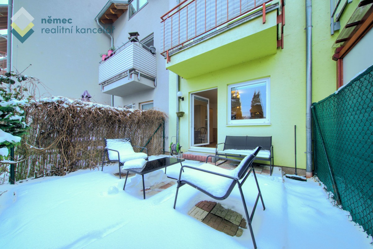 A v ulici U dráhy právě nabízíme dlouhodobý pronájem světlého 1+kk o podlahové ploše 33, 73 m² s vlastní zahradou o ploše 83 m² v přízemí starší novostavby z roku 2007 ve velice klidné obytné čtvrti.
