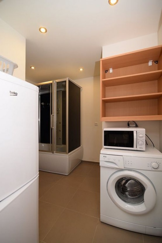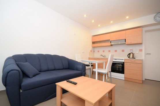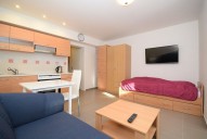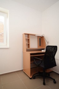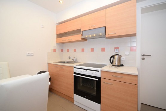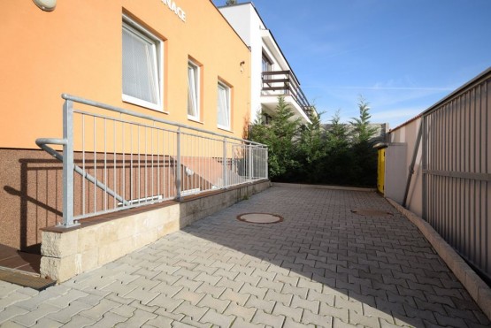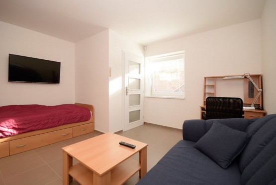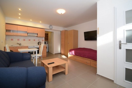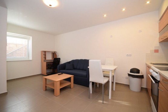 Nabízíme k pronájmu garsoniéru o velikosti 33 m2, která je situována v suterénu zubní ordinace na Praze 14 - Kyje. Byt je kompletně vybavený - nachází se zde sedací souprava, televize, postel, pracovní stů...l s židlí, jídelní stůl se židlemi, prostorné skříně. Kuchyňská linka je vybavena digestoří, sklo - keramickou deskou a elektrickou troubou. Ve vedlejší místnosti se nachází lednička, mikrovlnná trouba, pračka a masážní vana. Toaleta je umístěna samostatně. V celém bytě je podlahové topení. Byt je chráněn alarmem a kamerovým systémem. K bytu náleží privátní parkovací místo ve dvoře zubní ordinace a zahradní domek. Samozřejmostí je televizní připojení a internetové připojení. Veškerá občanská vybavenost se nachází v okolí školy, pošta, supermarket Albert, Obchodní centrum Černý Most. Dopravní dostupnost 2 minuty na stanici metra Rajská zahrada, 3 minut na stanice autobusů.
