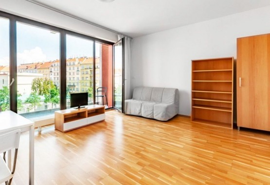 Moderní, vybavený byt 1+kk k pronájmu s balkonem, parkovacím místem a sklepem v ceně nájmu umístěný ve 5. podlaží rezidenčního komplexu Korunní Dvůr s nonstop recepcí, ostraho...u a společným upraveným vnitroblokem v oblíbené pražské čtvrti Vinohrady. Výhodná lokalita přímo u zastávky tramvaje a v pěším dosahu stanice metra Flora.