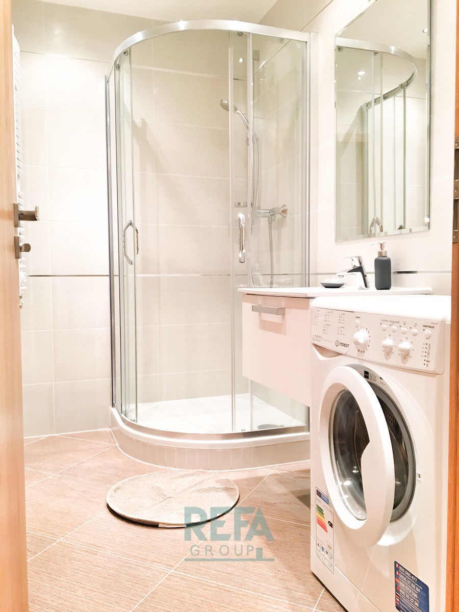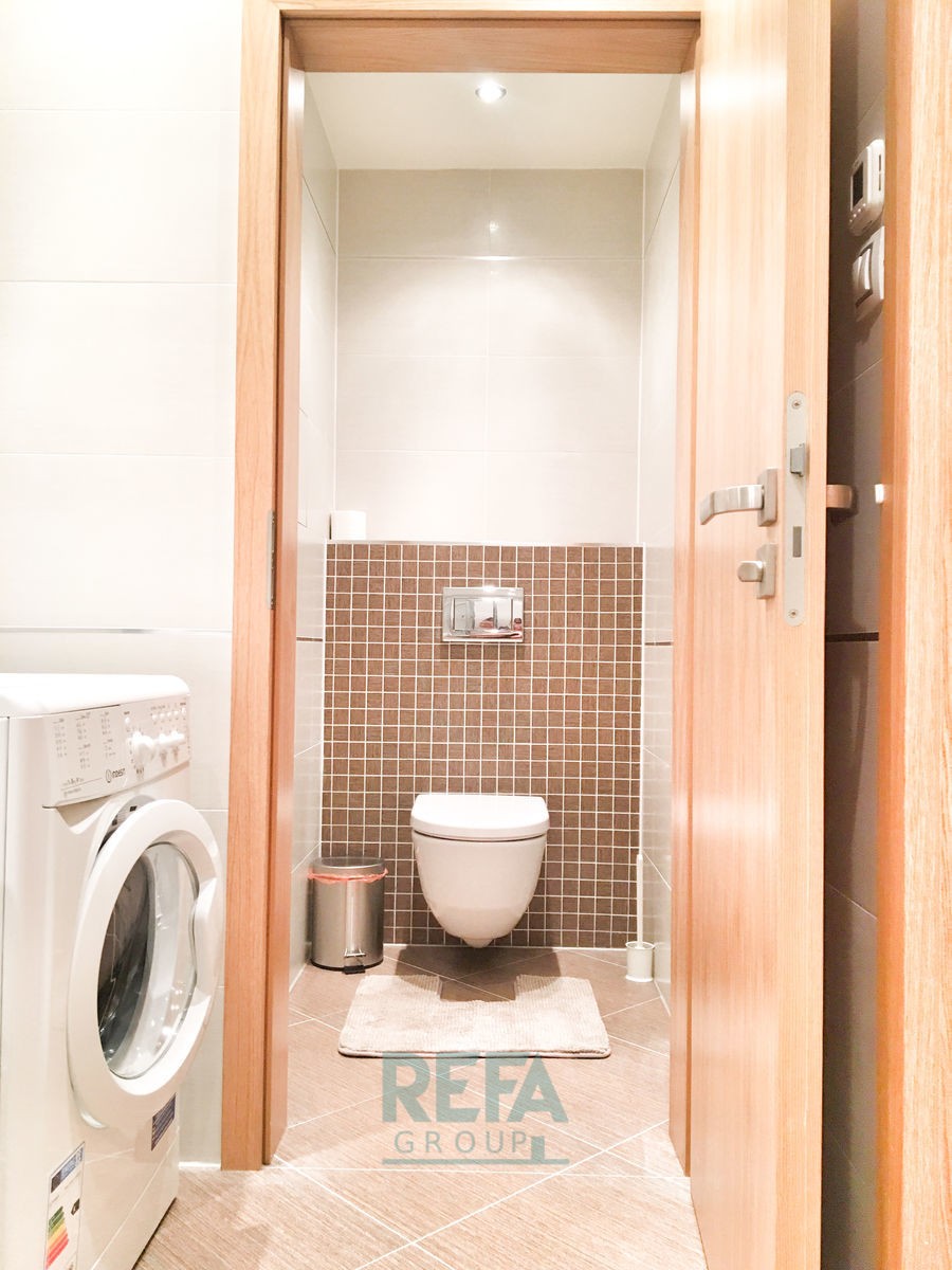 Dispozice: obývací pokoj... s kuchyňským koutem a postelí, koupelna se sprchovým koutem, pračkou a toaletou. V pokojích je laminátová podlaha, v koupelně je keramická dlažba. Kuchyňská linka je vybavena vestavěnými spotřebiči (sklo - keramická varná deska, horkovzdušná trouba, lednice). K bytu lze zvlášť pronajmout také parkovácí stání.
