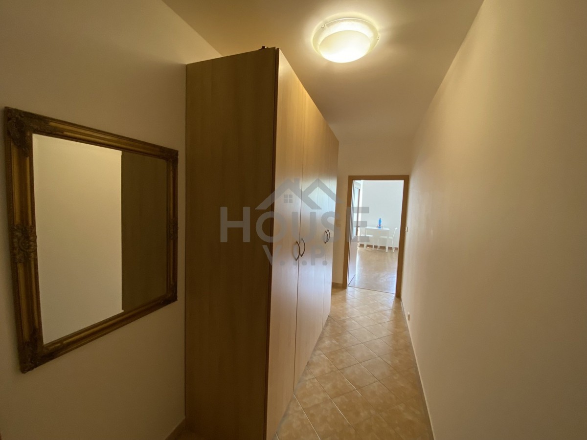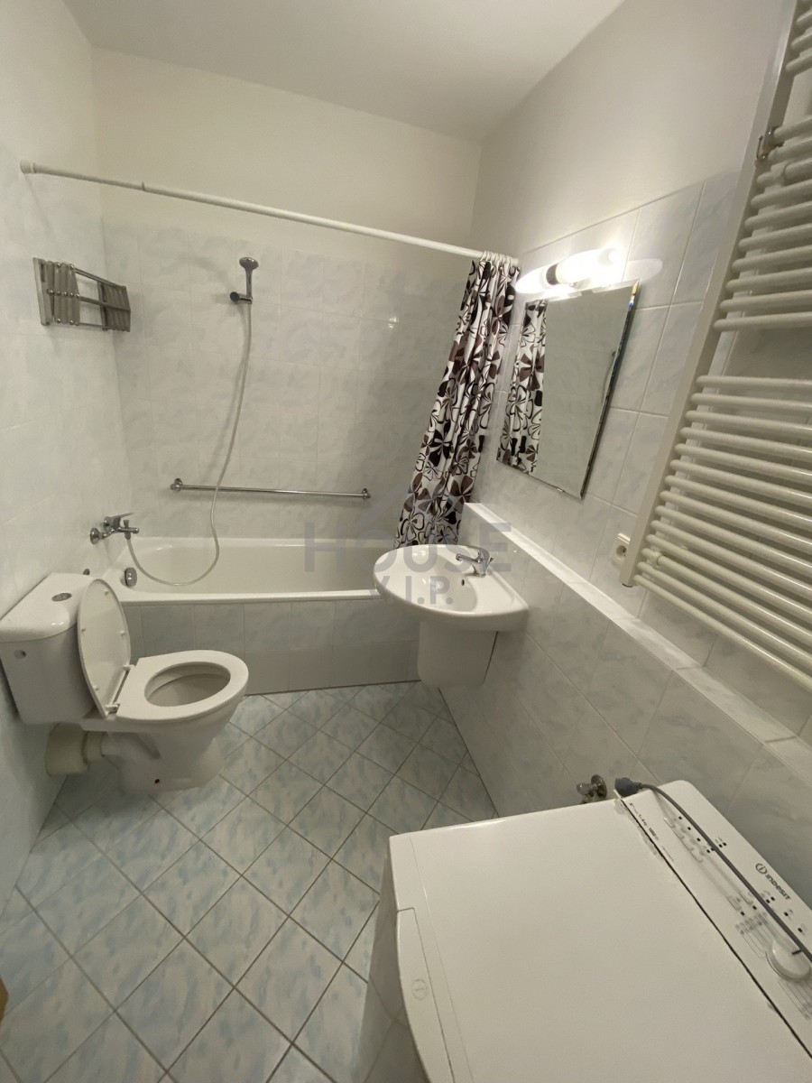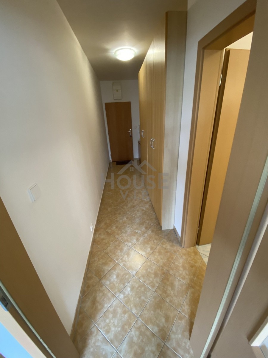 Při vstupu do bytu je dlouhá chodba, kde jsou dvě vestavěné skříně, zrcadlo a věšák. Na podlaze je dlažba stejně jako v koupelně. Koupelna je velice prostorná s vanou, sociální zařízení WC a pračkou.