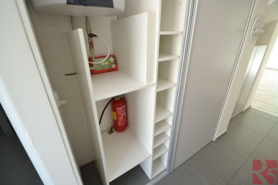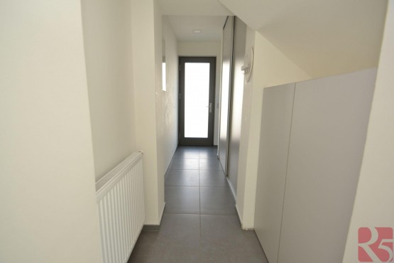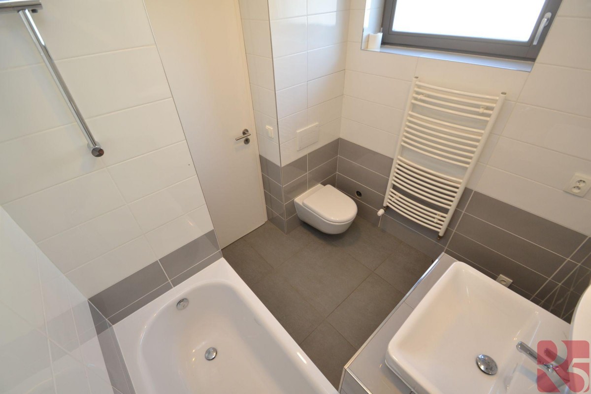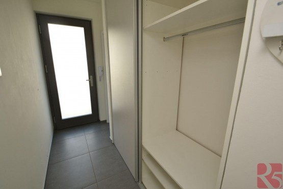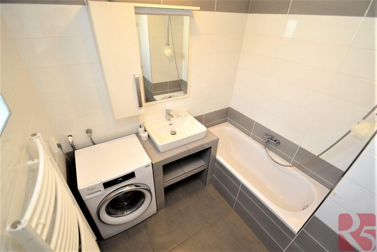 Byt má bezpečnostní dveře za kterými je vstupní chodba s vyhřívanou podlahou a prostornou šatní skříní a menší vestavenou komodou. Koupelna s vanou a oknem, to poskytuje přirozené světlo a možnost vyvětrání koupelny. Toaletní skříňka s úložným prostorem a zrcadlem, zde i připojení na pračku.