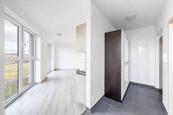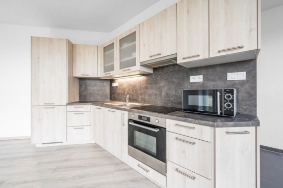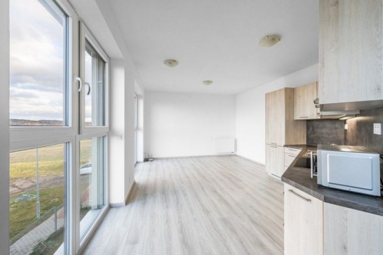 Dispozice bytu zahrnuje otevřený prostor obývacího pokoje s kuchyňskou linkou, malou chodbičku s šatní skříní a koupelnu s vanou, toaletou a pračkou. Kuchyňská linka je vybavena lednicí s mrazákem, sklokeramickou deskou, digestoří a mikrovlnou troubou. Všechna okna i balkonové dveře jsou vybavena venkovními žaluziemi. K bytu náleží zděný sklep (1, 92m2) a jedno garážové stání, které je zahrnuto v ceně.