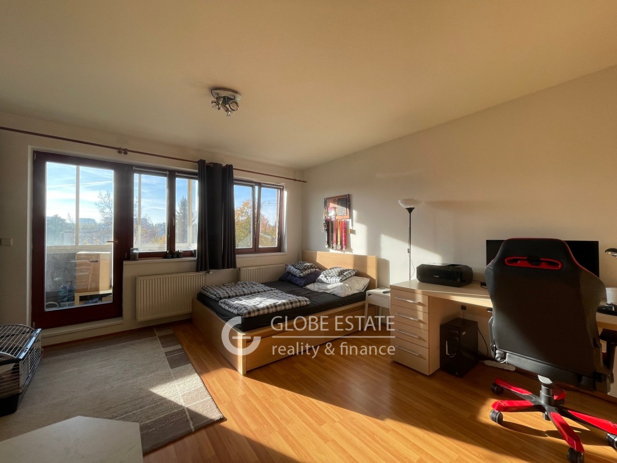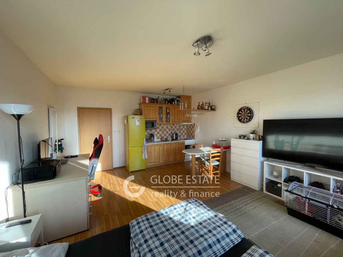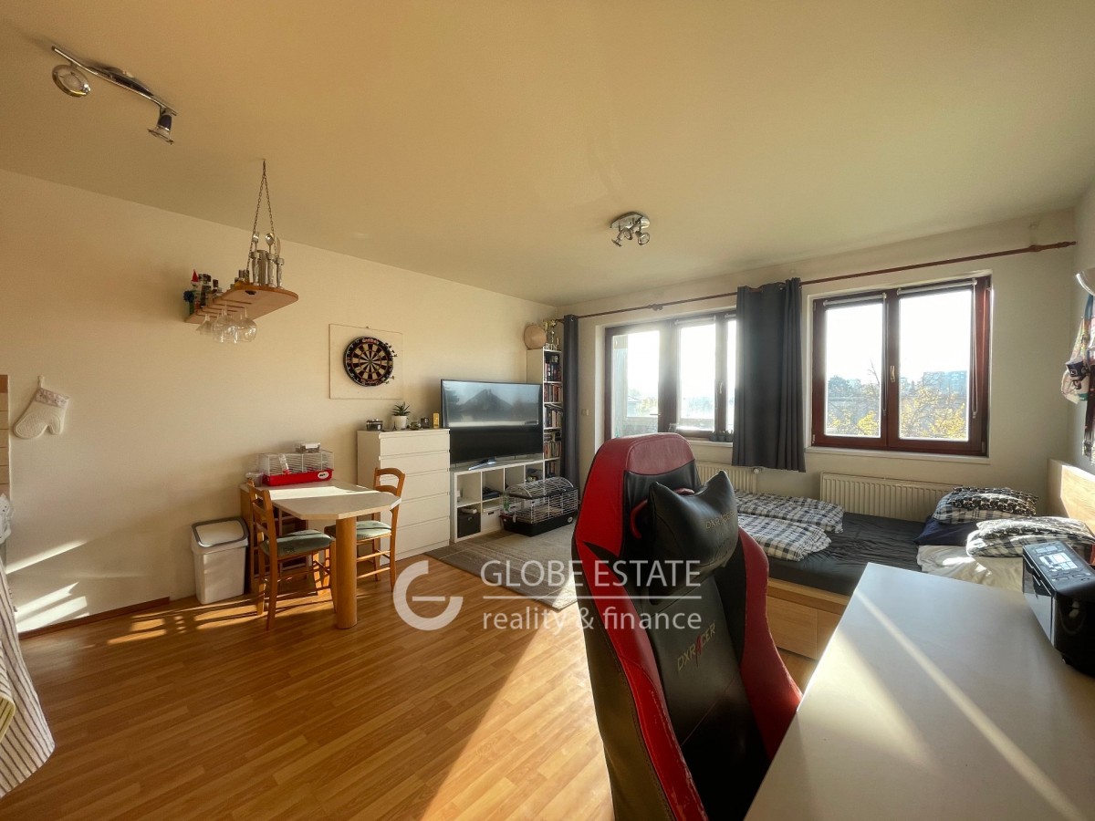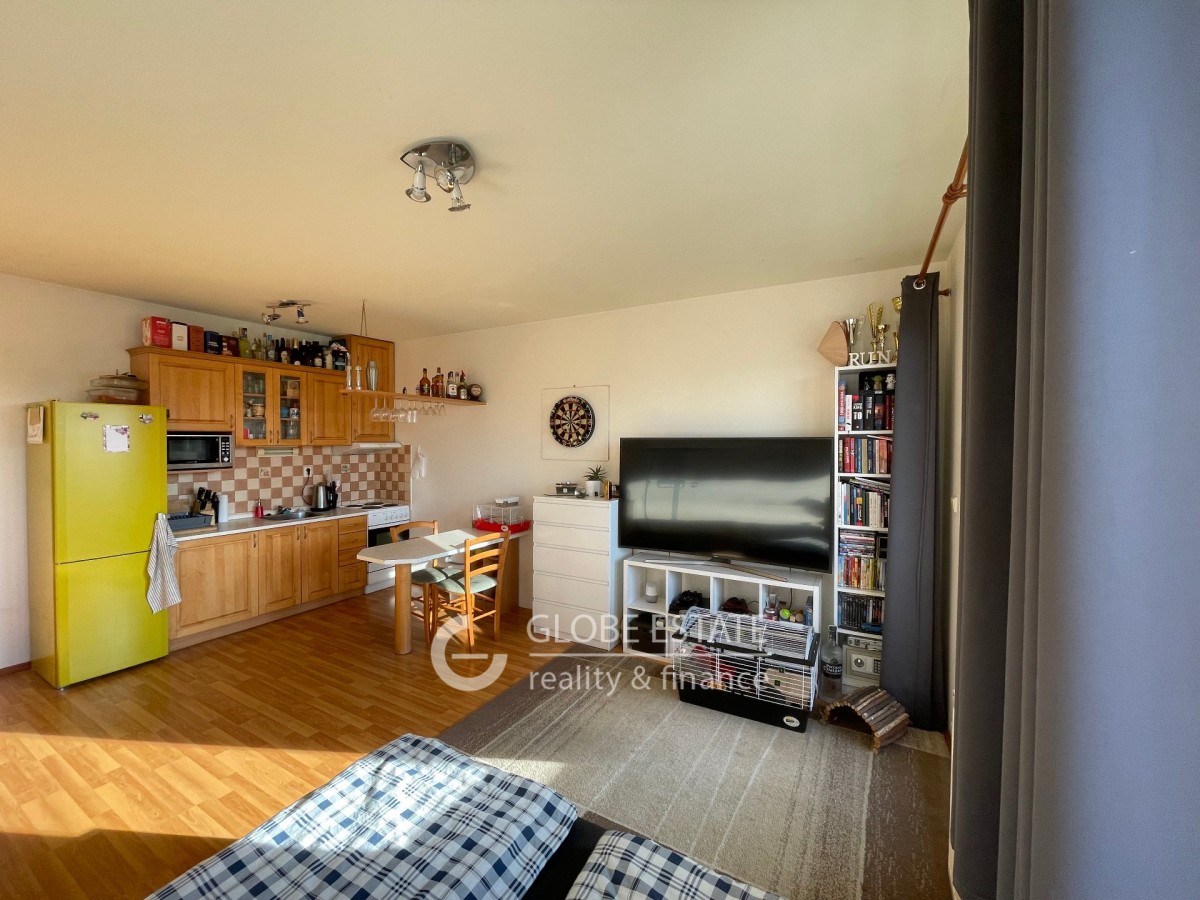 Nabízíme k pronájmu slunný byt 1 kk s jižní orientací o velikosti 43 m2 v rezidenčním uzavřeném objektu v pražských Štěrboholech. Byt je částečně vybaven. Nachází se v prvním patře pětipodlažní budovy včetně výta...hu. V blízkosti nemovitosti je veškerá občanská vybavenost. Dopravní dostupnost do centra Prahy je autobusovou linkou 5 minut na metro Depo Hostivař. Z chodby je vstup do koupelny a obývacího pokoje s kuchyňskou linkou. Koupelna má sprchový kout a společně toaletu. Z obývacího pokoje je vstup dna zasklený balkon o velikosti 2, 5 m2.
