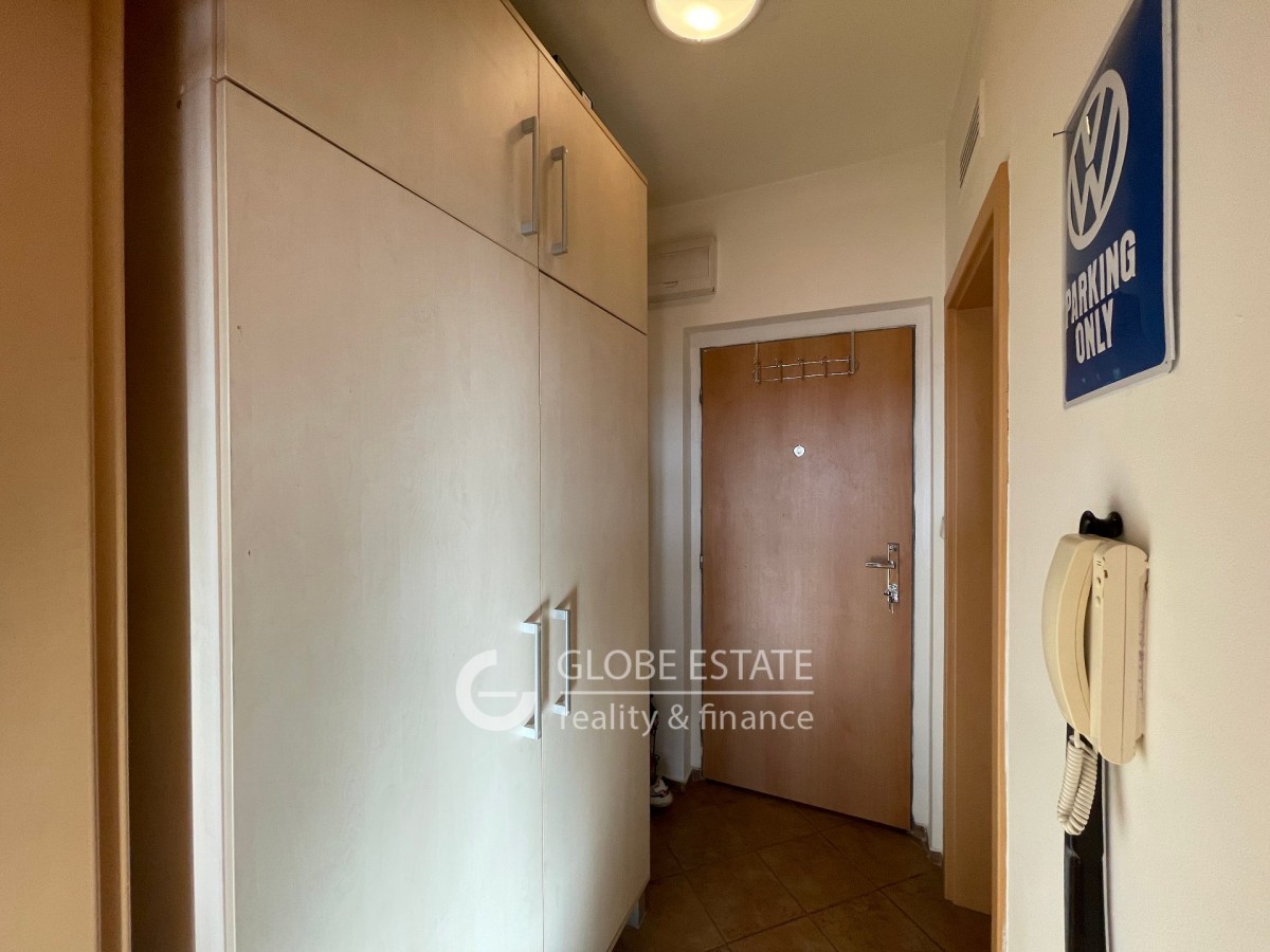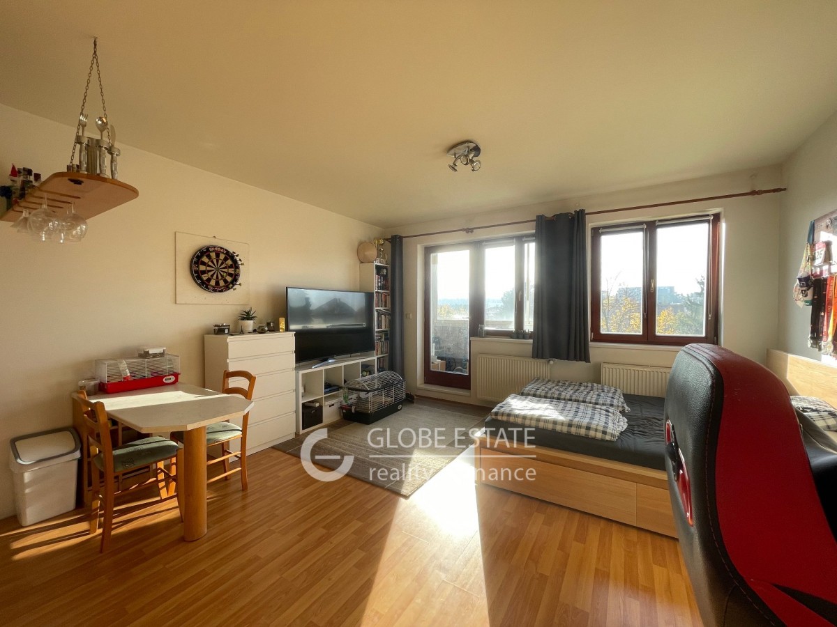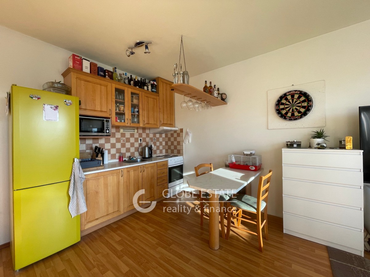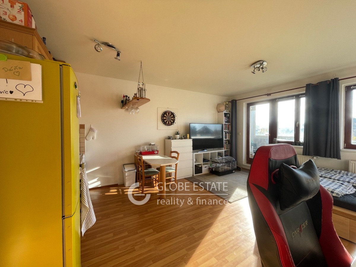 Nabízíme k pronájmu slunný byt 1 kk s jižní orientací o velikosti 43 m2 v rezidenčním uzavřeném objektu v pražských Štěrboholech. Byt je částečně vybaven. Nachází se v prvním patře pětipodlažní budovy včetně výta...hu. V blízkosti nemovitosti je veškerá občanská vybavenost. Dopravní dostupnost do centra Prahy je autobusovou linkou 5 minut na metro Depo Hostivař. Z chodby je vstup do koupelny a obývacího pokoje s kuchyňskou linkou. Koupelna má sprchový kout a společně toaletu. Z obývacího pokoje je vstup dna zasklený balkon o velikosti 2, 5 m2.