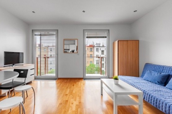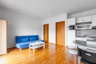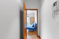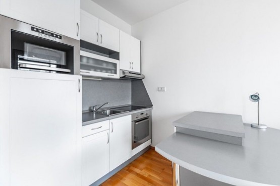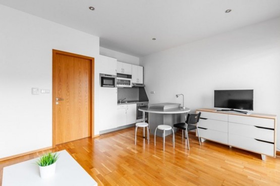 Vybavení bytu zahrnuje plně zařízenou kuchyň v bílém designu (lednice, mrazák, mikrovlnná trouba, odsavač par, sklo - keramická deska), TV, komoda, pračka, jídelní stůl se židlemi, pohovka, vstupní bezpečnostní dveře.