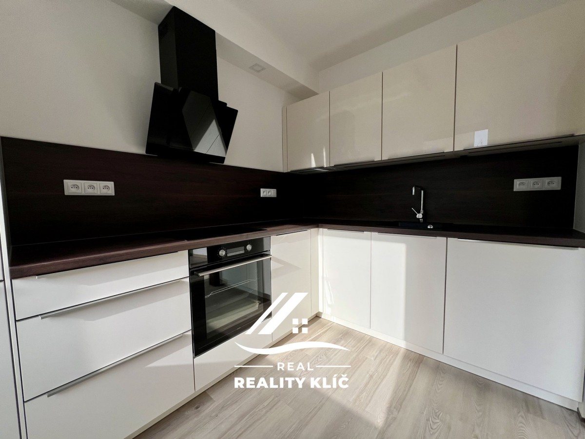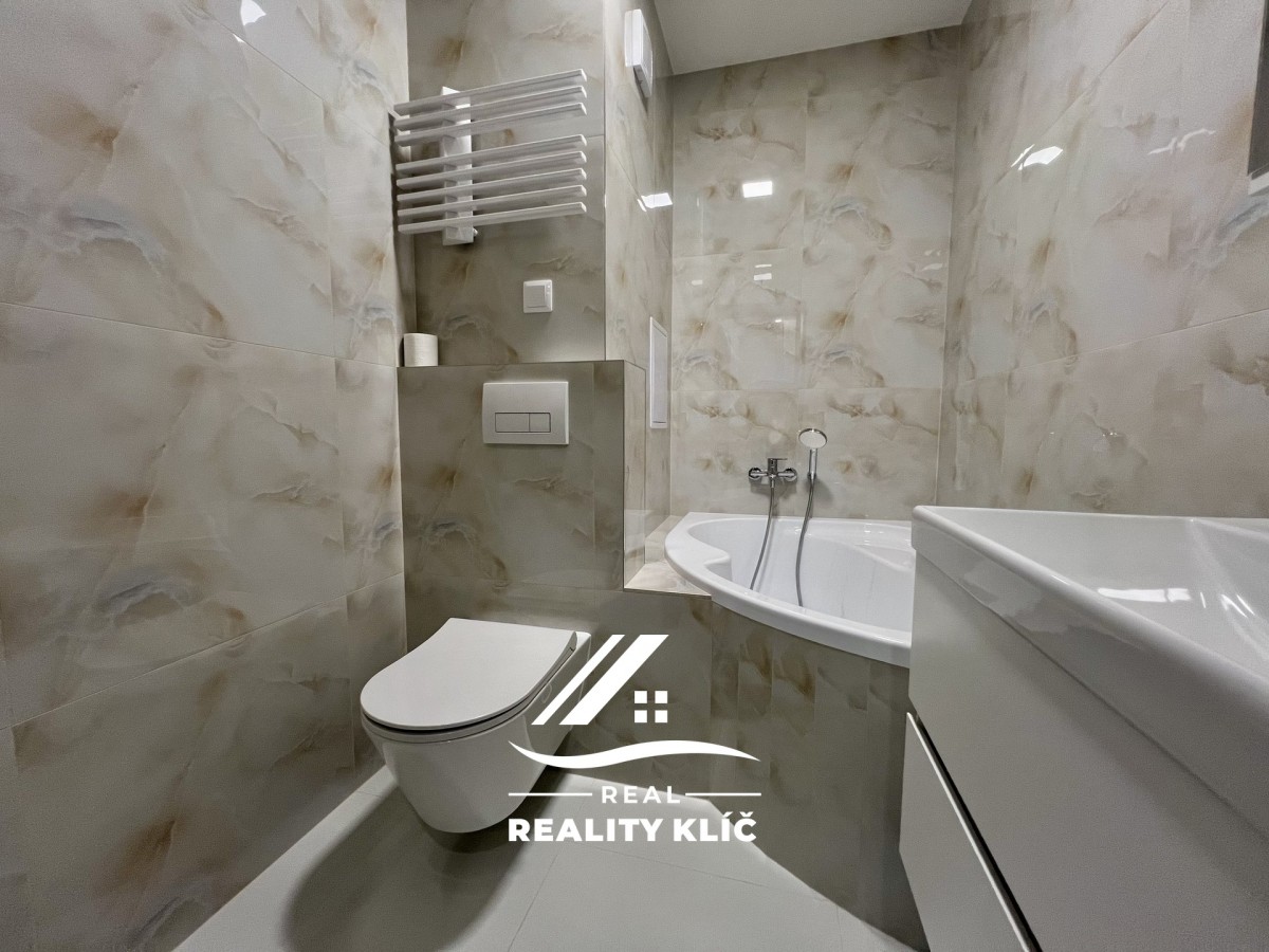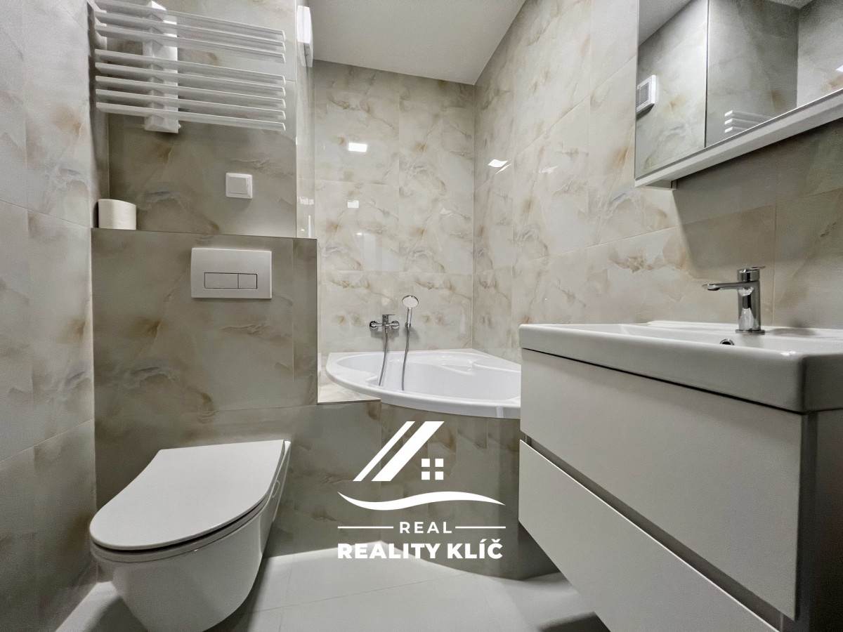 Dominantou bytu je útulný a světlý obývací pokoj, který díky své orientaci nabízí dostatek denního světla. Kuchyň je vybavena moderní kuchyňskou linkou včetně indukční varné desky, elektrické trouby, digestoře, myčky nádobí, lednice s mrazákem a pračky. Koupelna je společná s sociální zařízení WC a je vybavena vanou, umyvadlem se skříňkou a zrcadlem.