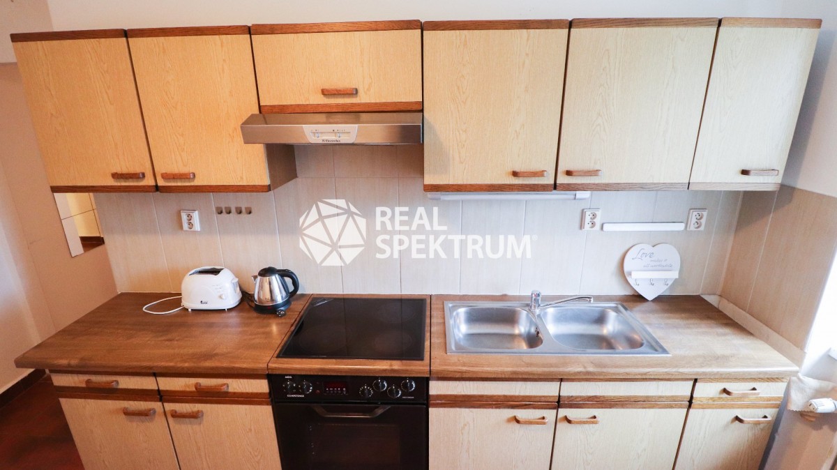 Byt 2+1, vstupní chodba (botník), komora (policový regál), pokoj (3 krát šatní skříň), pokoj (komoda), kuchyň (el. varná deska, el. trouba, digestoř, lednice, mikrovlná trouba, stůl, 3 krát židle, komoda), koupelna (vana, sociální zařízení WC, pračka, skříňky). Bytovou jednotku je možné dále dozařídit nábytkem. K bytu náleží 2 krát sklep, společná kolárna. Bližší informace v RK.