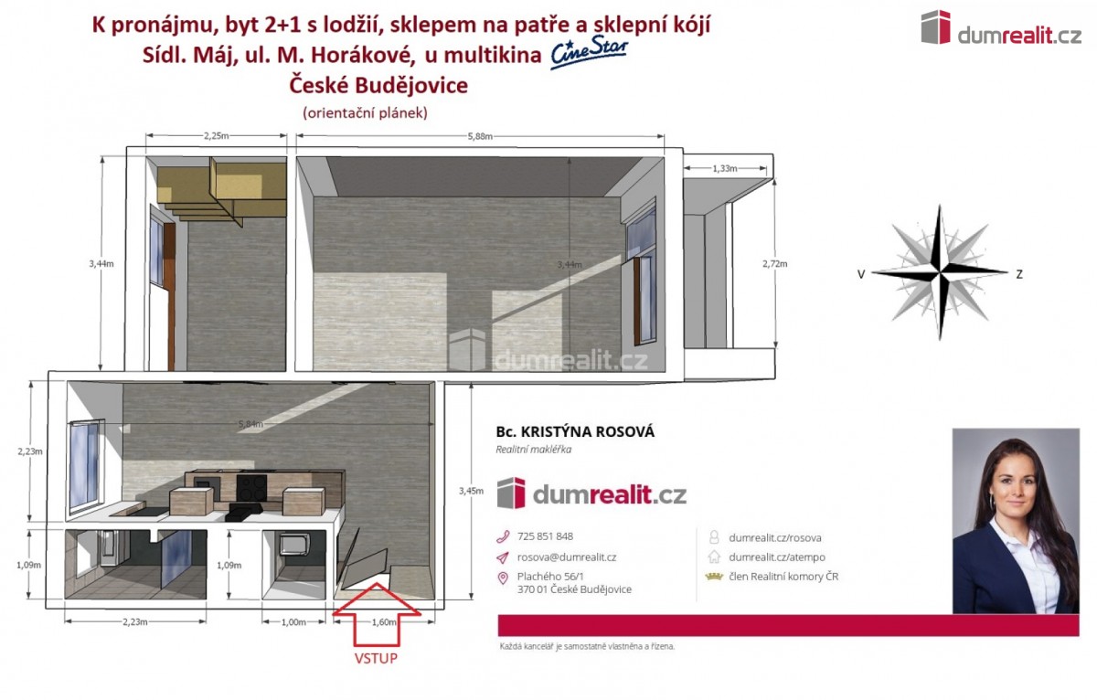 + poplatky 2. 500, - Kč/měsíc/2 osoby + el. energie, která se převádí na nájemce. . Dumrealit. cz Vám nabízí pronájem světlé, stylově zrekonstruované bytové jednotky o dispozici 2+1...br> s lodžií, sklepem na patře a sklepní kójí na sídlišti Máj u multikina Cinestar, ul. M. Horákové ve městě České Budějovice. Podrobné rozkreslení dispozice naleznete na orientačním plánku mezi fotografiemi. Orientace bytu je na východní a západní světovou stranu. Byt s lodžií se nachází v 5. patře zatepleného panelového domu včetně výtahu. Nájemné činí 13. 000, - Kč + zálohy na energie ve výši 2. 500, - Kč + elektrická energie, která se převádí na nájemce pro 2 osoby měsíčně. Hledáme solidní a dlouhodobé nájemníky. Doporučuji prohlídku, byt bude připraven k nastěhování 1. 3. 2026. V okolí je veškerá občanská vybavenost. Více info Vám poskytne realitní makléřka Bc. Kristýna Rosová z realitní kanceláře A TEMPO fungující pod ochrannou známkou dumrealit. cz. Ev. číslo: 654629. Energetický štítek: G