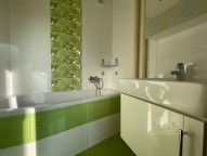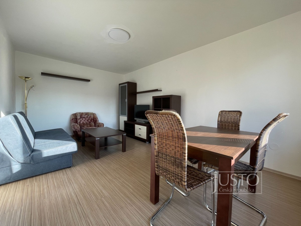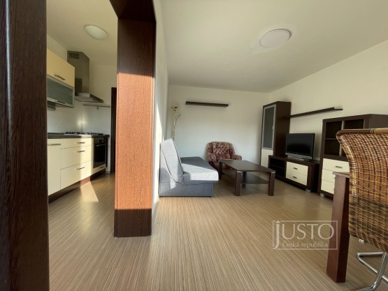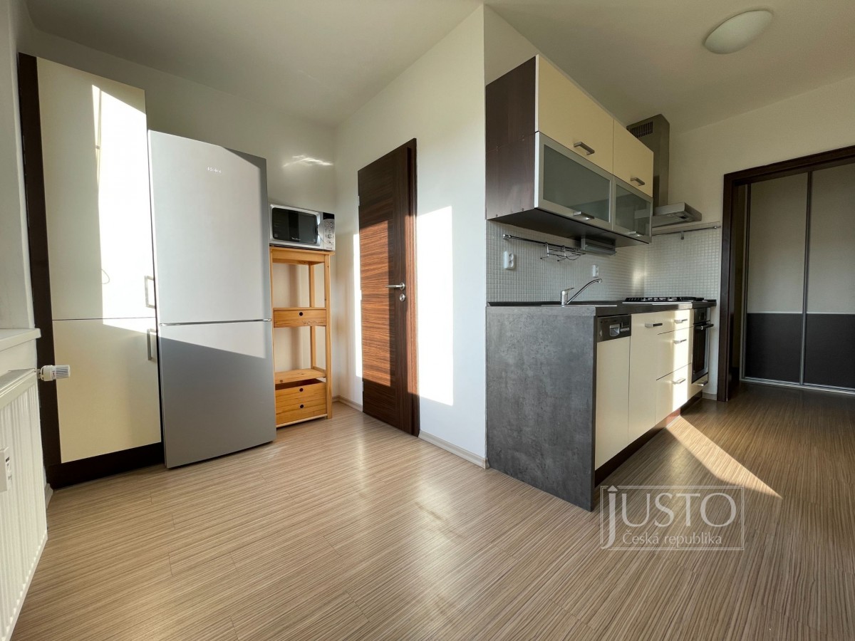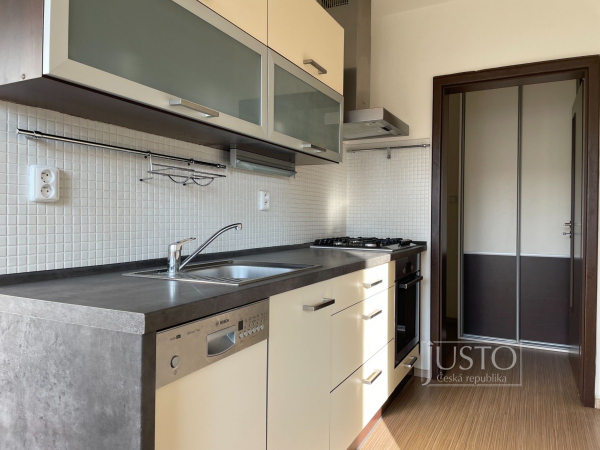 Dále z předsíně projdete do plně vybavené moderní kuchyně (mikrovlnná i horkovzdušná trouba, plynový sporák, digestoř, myčka nádobí, lednice s mrazákem, základní nádobí). Do kuchyně se Vám vejde i stůl se čtyřmi židlemi. Ten je nyní umístěný v obývacím pokoji. Vybavený světlý obývací pokoj je stejně jako celý byt situován také na západ. Na oknech jsou nové žaluzie. Koupelna má prostornou vanu, umyvadlo i přípojky vody/odpadu pro pračku.