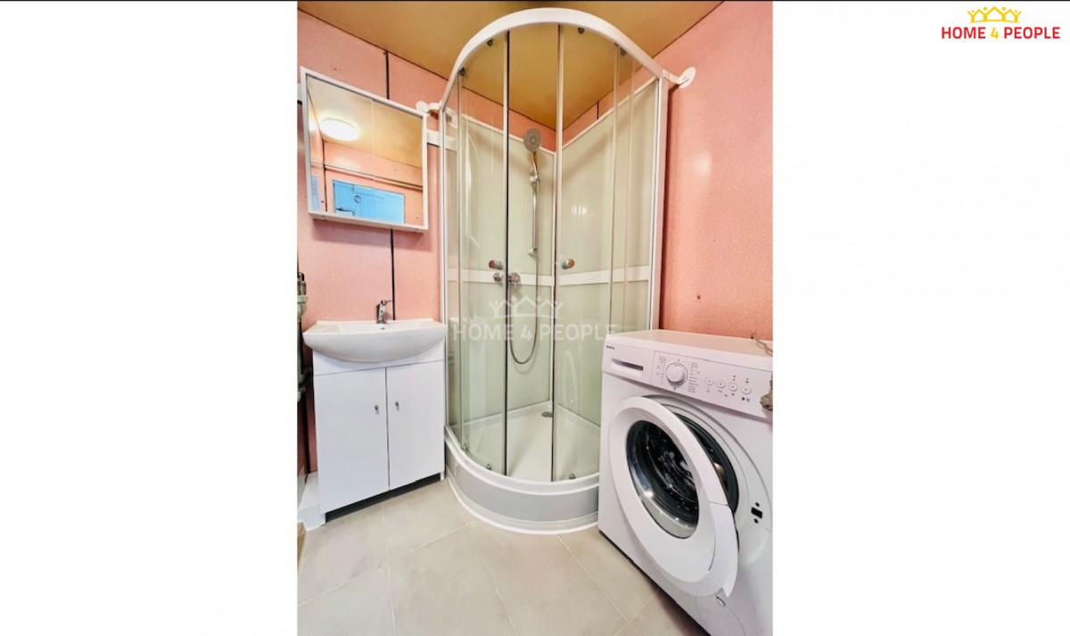 Koupelna se sprchovým koutem, umyvadlo se skříňkou, nová pračka.