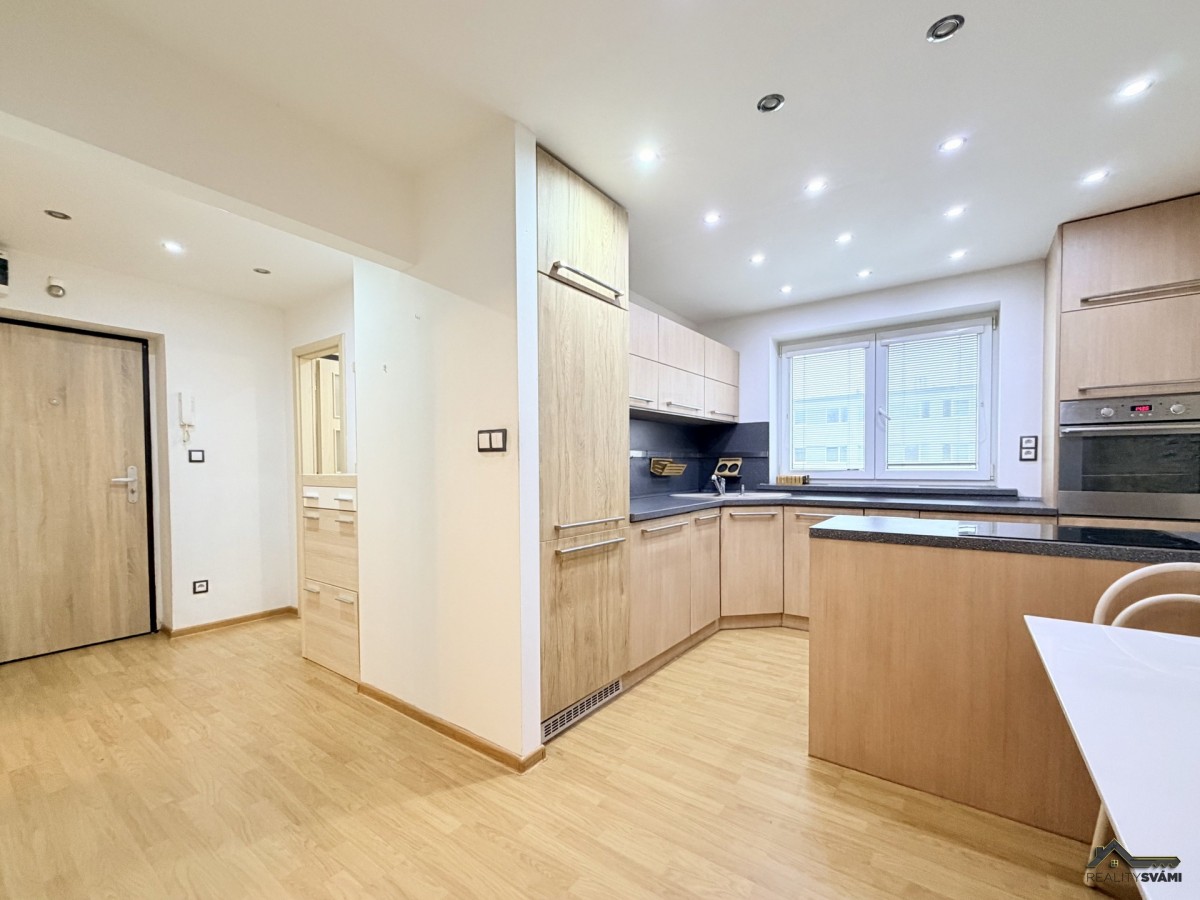 Dominantou bytu je nová moderní kuchyňská linka vyba...vená spotřebiči a praktickým kuchyňským ostrůvkem, ve kterém je umístěna varná deska a dostatek úložného prostoru. Byt působí vzdušně a současně díky kvalitnímu provedení a promyšleným detailům.