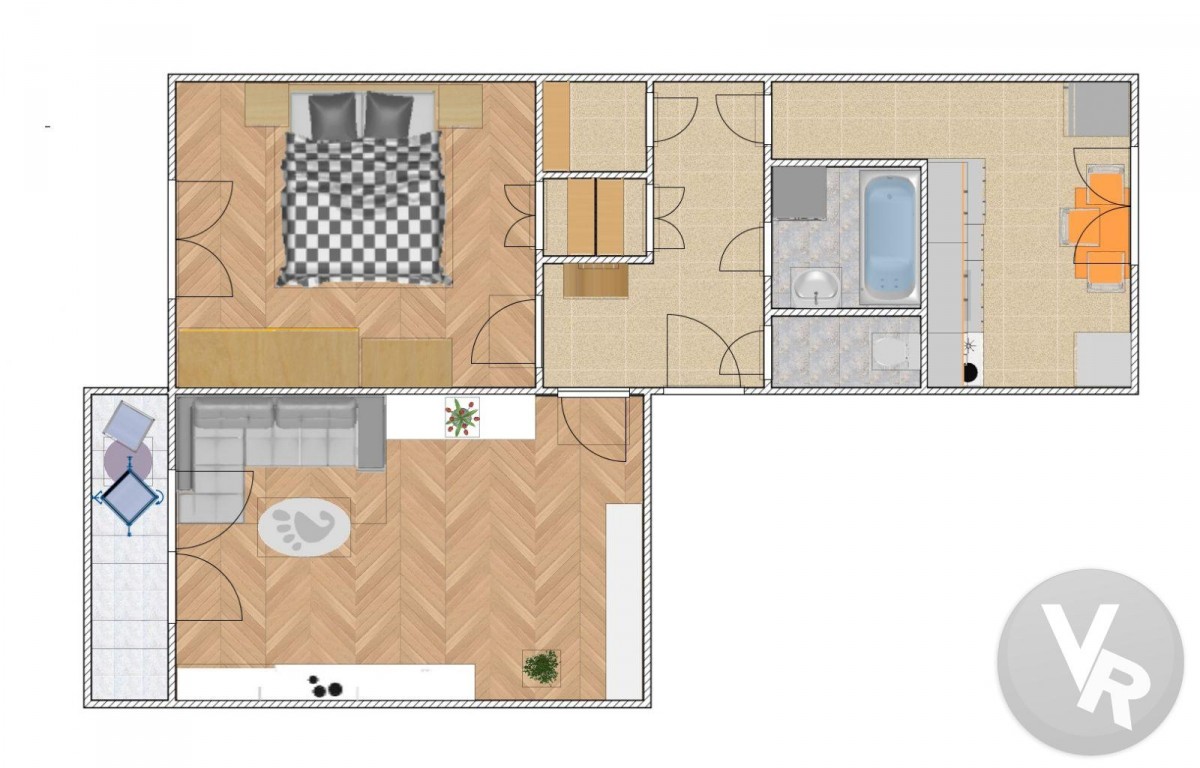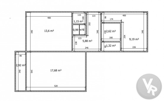 Dispozice bytu: Chodba 5, 88 m2, z chodby je vstup do všech částí bytu. Obývací pokoj 17, 68 m2, ze kterého je vstup na balkon 2, 92 m2, ložnice 13, 6 m2, komora 0, 99 m2, druhá komora 1, 15 m2, koupelna s vanou 2, 62 m2, samostatná toaleta 1, 32 m2 a kuchyň 9. 19 m2.