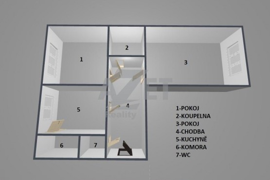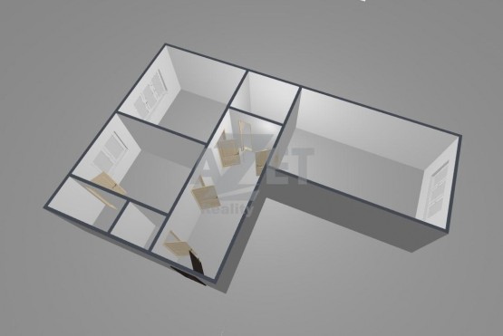Okna kuchyně a jednoho z pokojů jsou orientována na sever, okna druhého pokoje poté na jih.