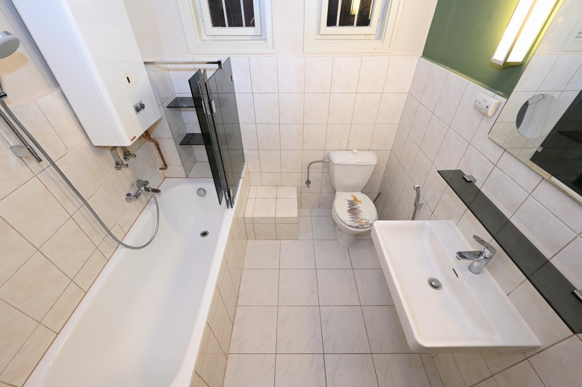 Koupelna s vanou, pračka, toaleta. V chodbě je menší vestavěná skříň.