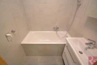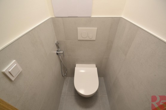 Koupelna s vanou, umyvadlovou a zrcadlovou skříní. Toaleta samostatně s bidetovou sprškou.