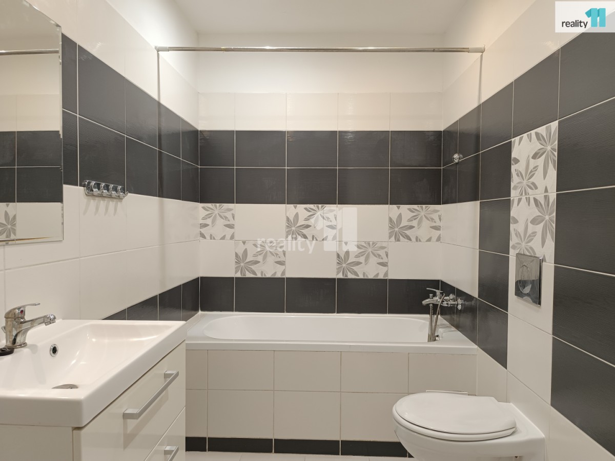 Prostorná koupelna se zděným jádrem, vanou, novým zrcadlem a keramickými obklady.