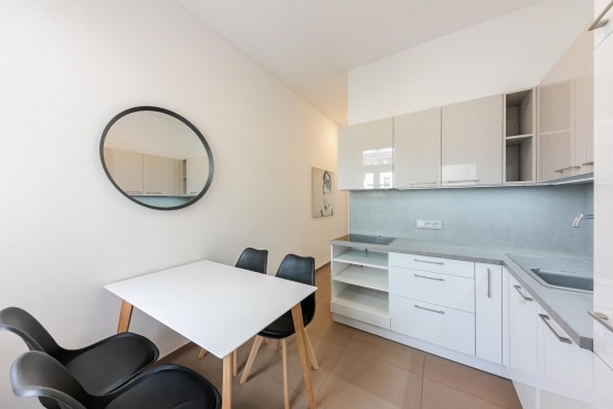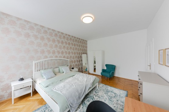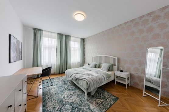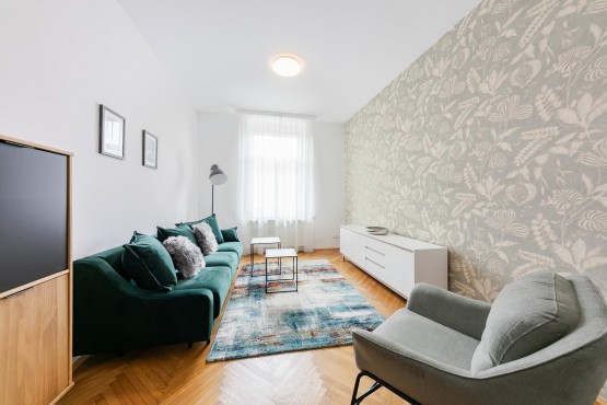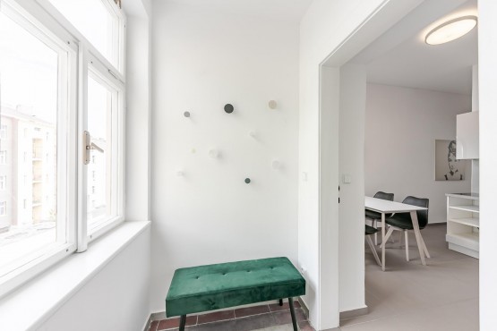 Byt se nachází ve 4. patře bez výtahu. Velké úložné prostory, jižní orientace obývacího pokoje a ložnice. Citlivá rekonstrukce celého bytu, který byl kompletně vybavené nábytkem. Design dodalo studio Apparel. Oproti fotografiím nově dodána trouba a pračka.