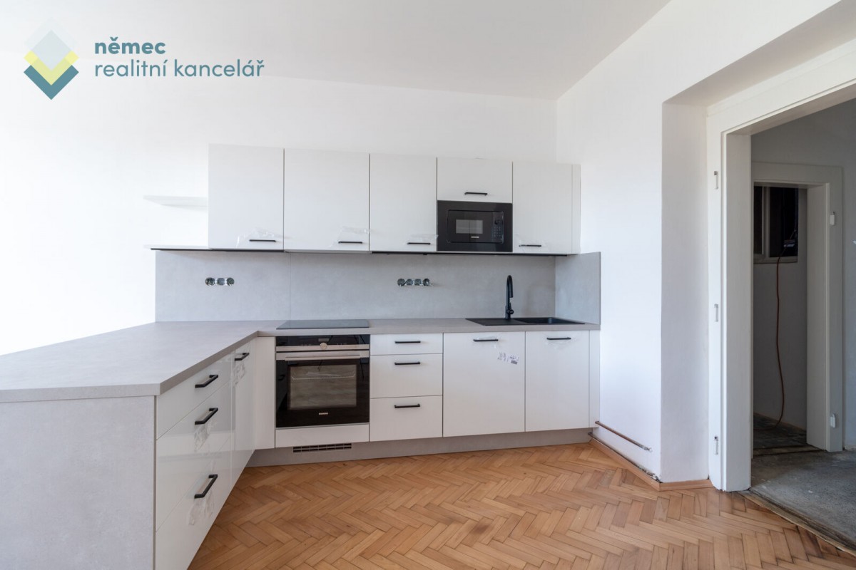 Byt je kompletně nově zrekonstruovaný a noví nájemníci mohou využít zařízenou kuchyňskou linkou umístěnou v největším pokoji o výměře 22, 6 m² s okny na náměstí Jiřího z Poděbrad. Myčka, sklokeramická varná deska, trouba, digestoř, zabudovaná lednice s mrazákem i mikrovlnná trouba jsou součástí vybavení kuchyně.