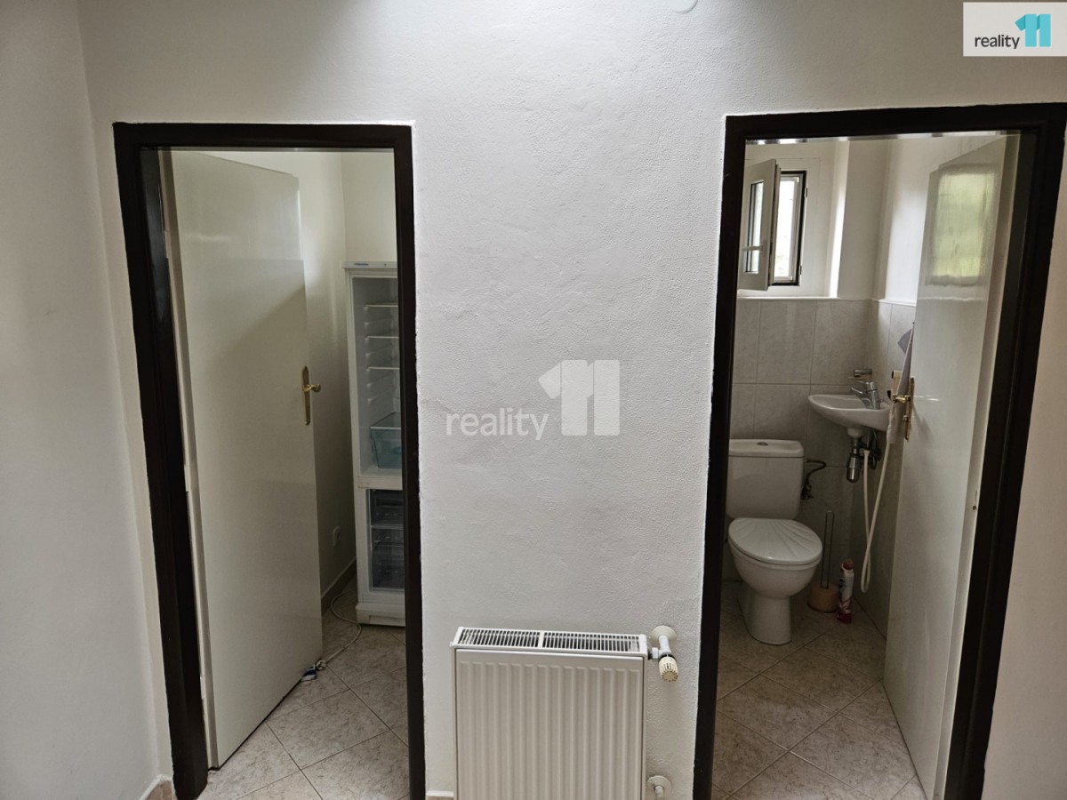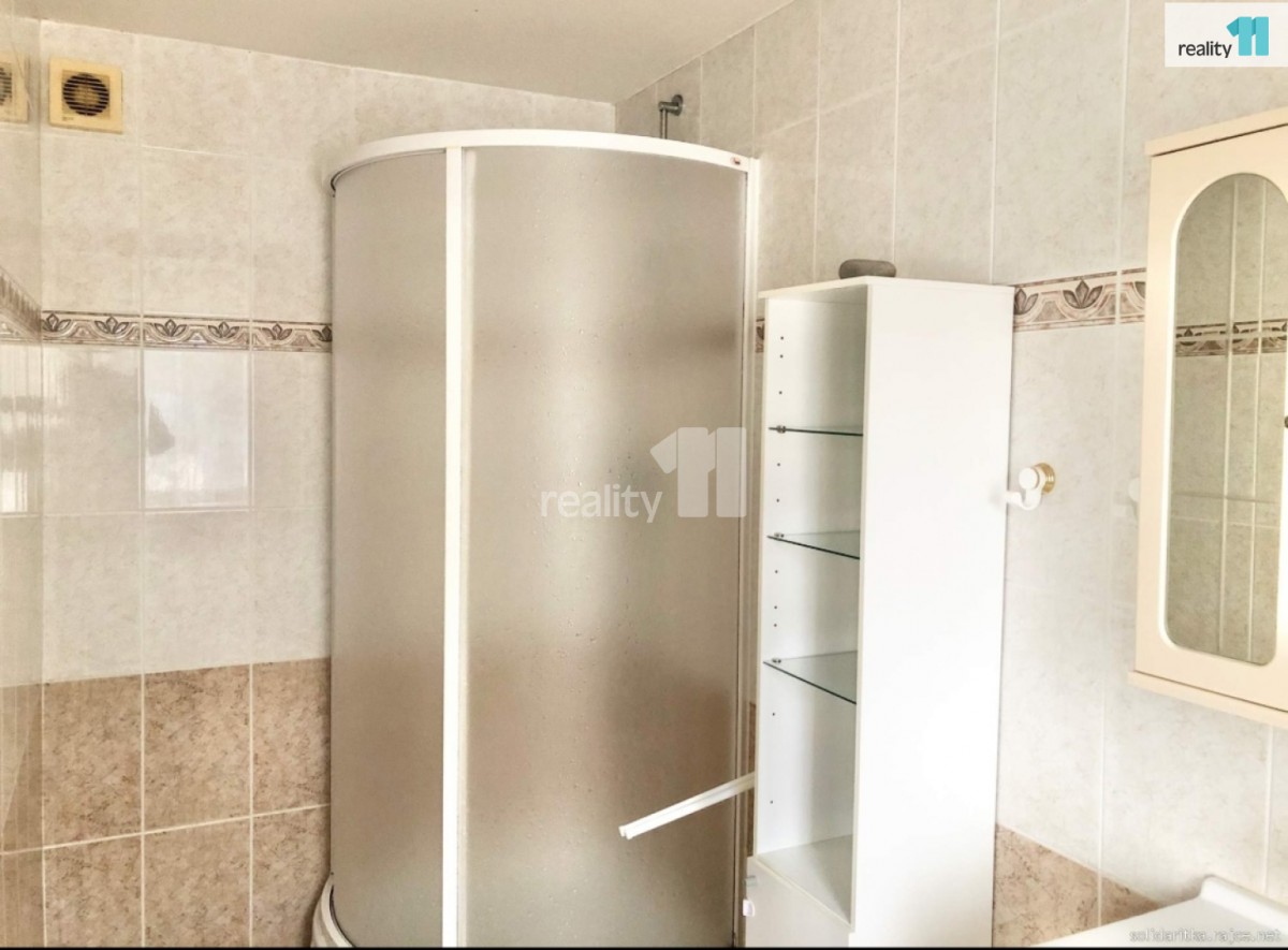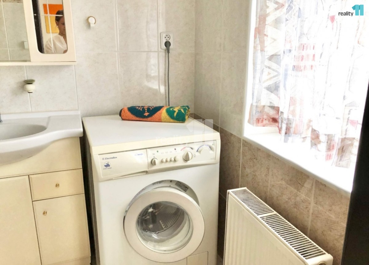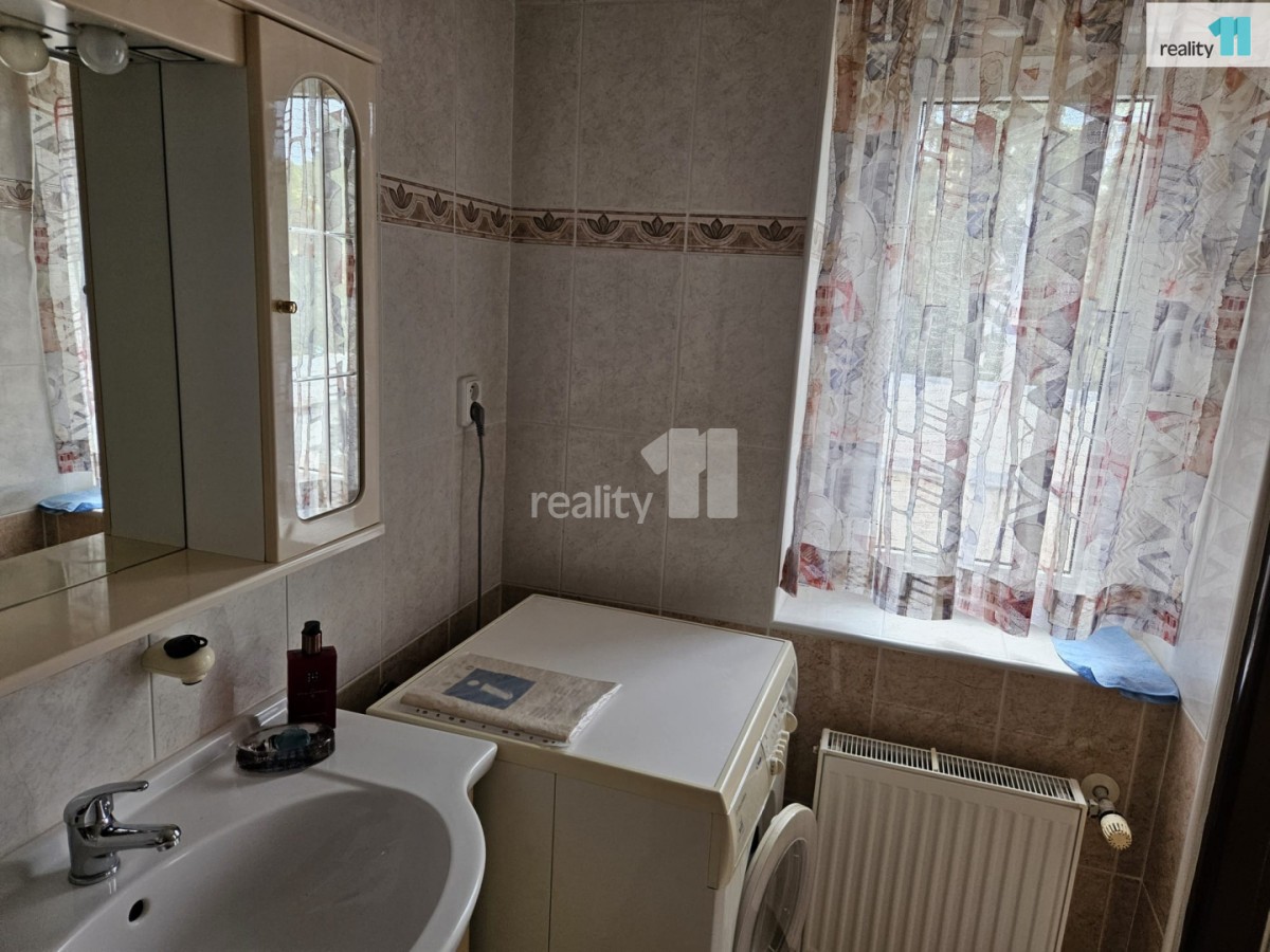 Koupelna se sprchovým koutem, pračka včetně sušičky, špajz včetně lednice/mrazáku. sociální zařízení WC samostatné.