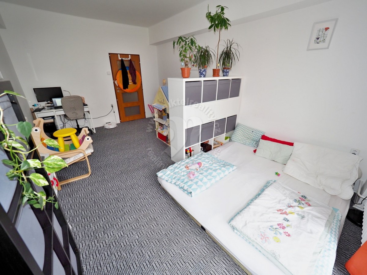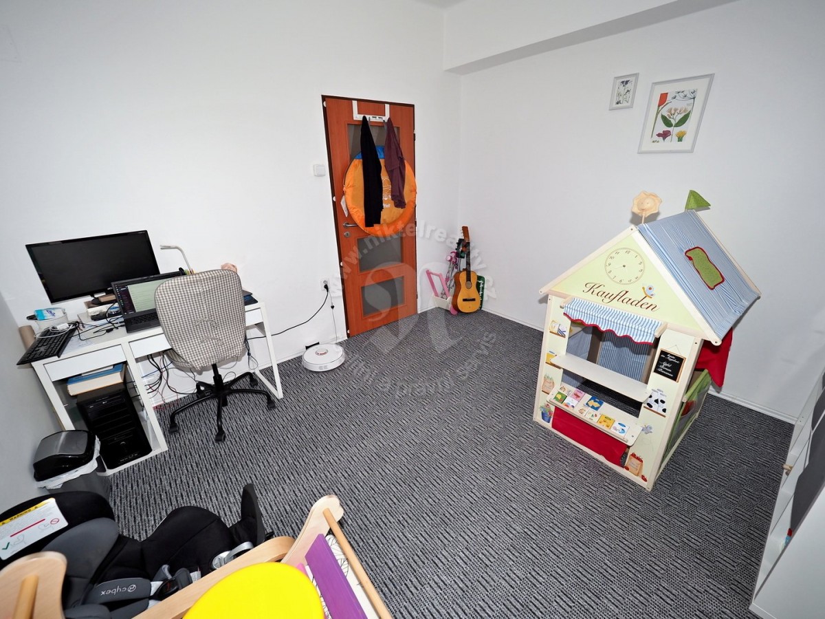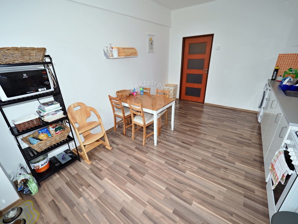 Dispozice: prostorná kuchyně s jídelnou (16 m2) s osazenou novější kuchyňskou linkou IKEA (2017), plynový sporák a místo jídelní stůl se židlemi, nové dvoudílné okno; velký neprůchozí obývací pokoj (19, 5 m2) s francouzským oknem (severovýchod) s parketami a kobercem; světlá ložnice (15 m2) s dvoudílným oknem na místní klidnou ulici (jihozápad); prostorná vstupní chodba (14 m2), ze které se vstupuje do všech uvedených místností, osazené vestavěné skříně IKEA; z chodby se rovněž vstupuje do koupelny (2, 3 m2) s osazenou hlubokou vanou a umyvadlem, nový keramický obklad stěn ve světle krémové barvě, samostatná toaleta (1, 1 m2), spíž/technická místnost přímo v bytě (2 m2). K bytu náleží zděný sklep v přízemí domu.