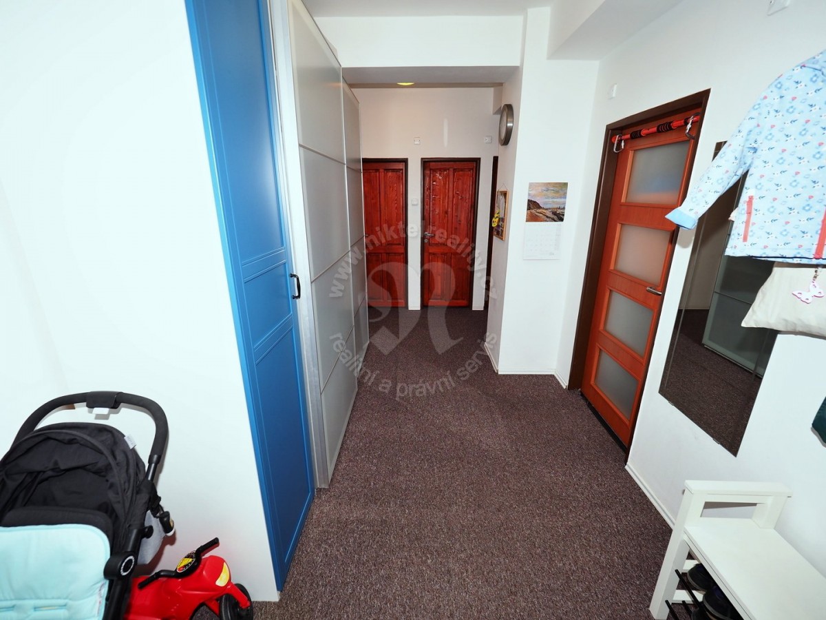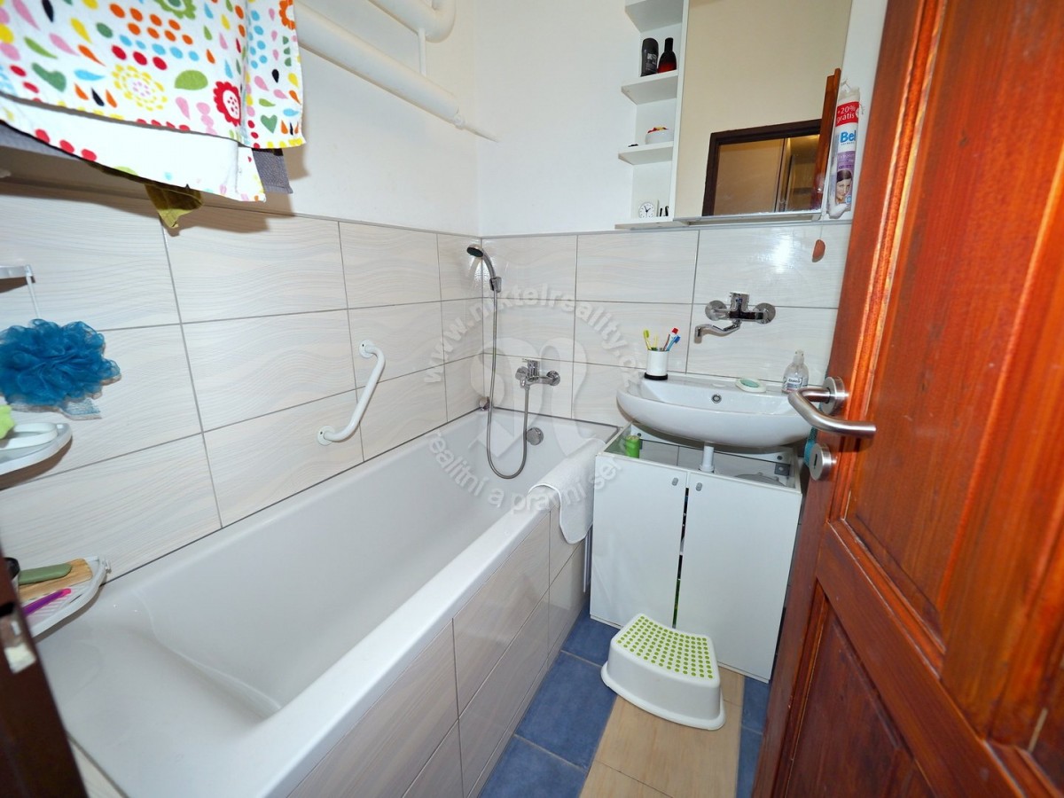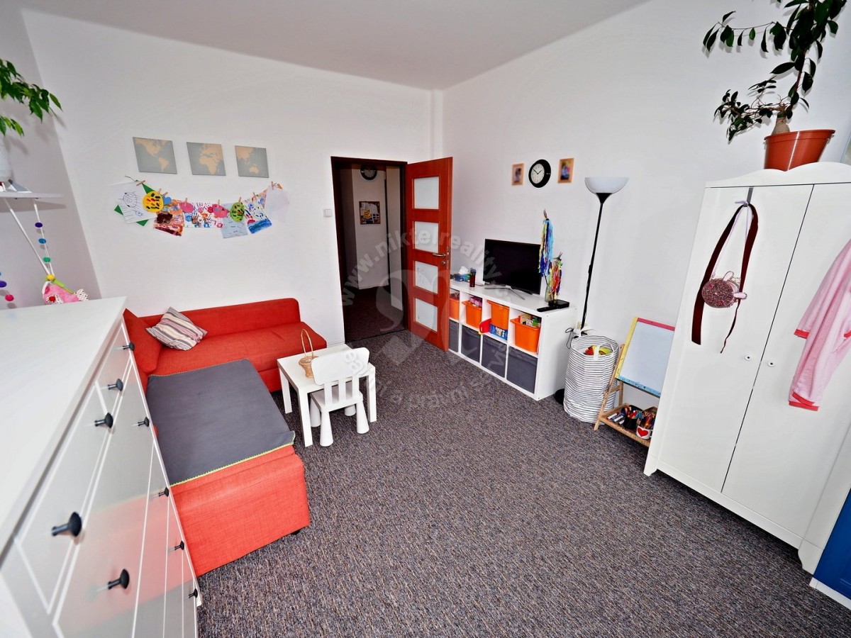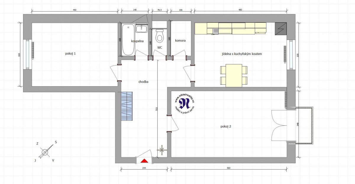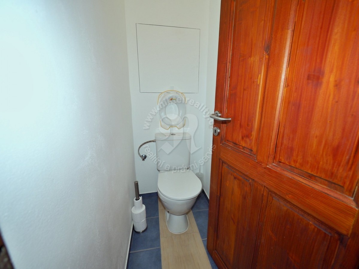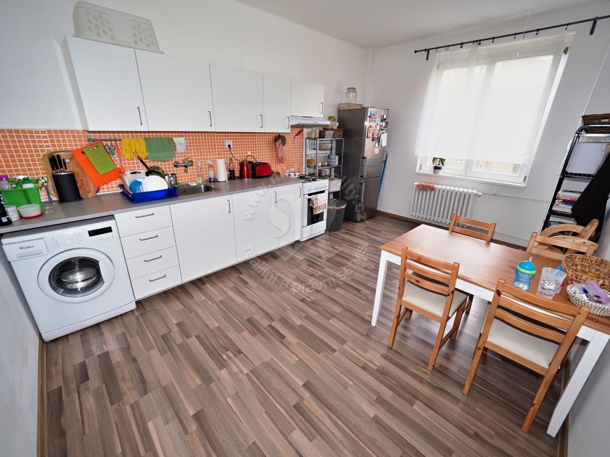Dispozice: prostorná kuchyně s jídelnou (16 m2) s osazenou novější kuchyňskou linkou IKEA (2017), plynový sporák a místo jídelní stůl se židlemi, nové dvoudílné okno; velký neprůchozí obývací pokoj (19, 5 m2) s francouzským oknem (severovýchod) s parketami a kobercem; světlá ložnice (15 m2) s dvoudílným oknem na místní klidnou ulici (jihozápad); prostorná vstupní chodba (14 m2), ze které se vstupuje do všech uvedených místností, osazené vestavěné skříně IKEA; z chodby se rovněž vstupuje do koupelny (2, 3 m2) s osazenou hlubokou vanou a umyvadlem, nový keramický obklad stěn ve světle krémové barvě, samostatná toaleta (1, 1 m2), spíž/technická místnost přímo v bytě (2 m2). K bytu náleží zděný sklep v přízemí domu.