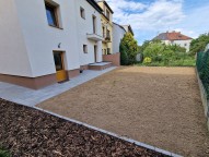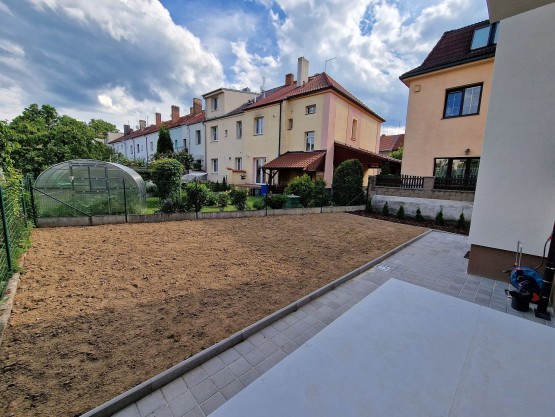 Z kuchyně se vstupuje na terasu a do zahrady, kterou bude užívat pouze nájemce tohoto bytu. Na terase o velikosti cca 6 m2 s výhledem do zeleného vnitrobloku je možné trávit chvíle relaxace. Vlastní zahrada nabízí mnoho možností využití, především však opět odpočinek, slunění a relaxaci. Na zahradu je nejen vstup z bytu, ale také venkovní vstup od parkovacího místa.