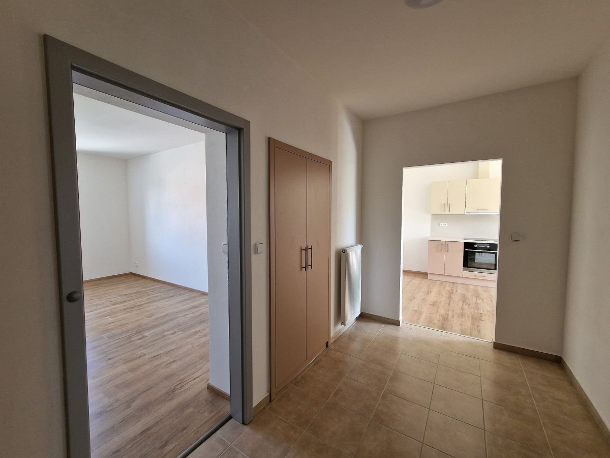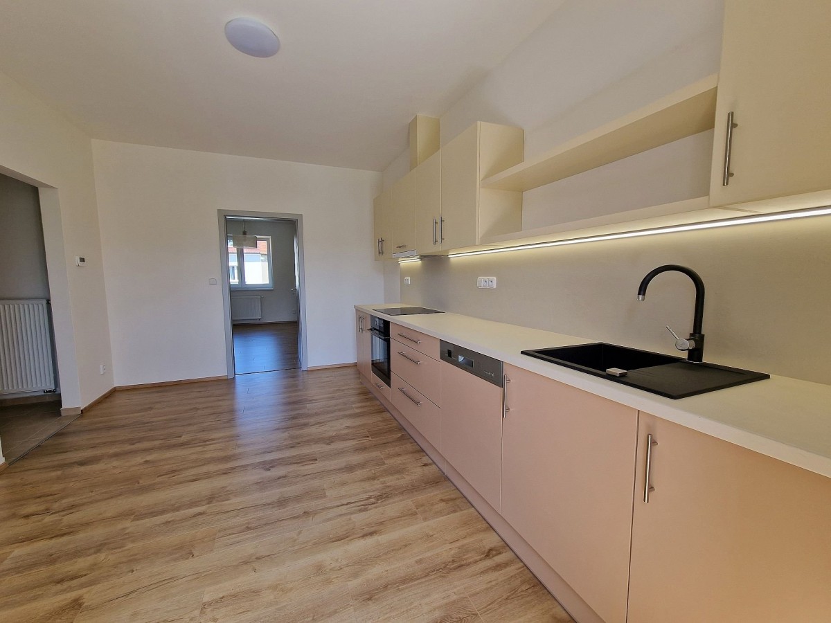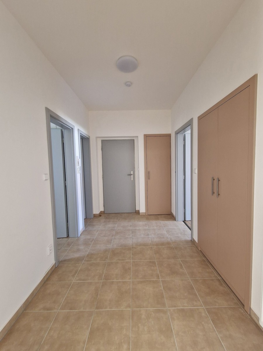Po vstupu do bytu Vás příjemně překvapí moderní a svěží design bytu. V kuchyni je nová kuchyňská linka, která je vybavena vestavěnými spotřebiči jako je elektrická varná deska, elektrická trouba, myčka na nádobí a digestoř. Předností této kuchyně je dostatek prostoru i pro jídelní kout. Obývací pokoj navazuje na kuchyň a tím nabízí praktické využití obytných prostor. Na zastřešeném balkóně o výměře cca 3 m2 s výhledem do zeleného vnitrobloku je možné trávit chvíle relaxace. Do ložnice se vstupuje samostatným vstupem z předsíně. V prostorné koupelně se sprchovým koutem a umyvadlem je příprava a místo pro umístění pračky. Na stěně je topný žebřík. Toaleta je samostatně. Ve vstupní hale je umístěna vestavěná skříň a je zde dostatek místa pro šatní věšák, zrcadlo atd. Zajímavostí je velice praktická, samostatná, zděná komora. V celém bytě jsou svítidla. Podlahu kryje laminátová plovoucí podlaha nebo dlažba.