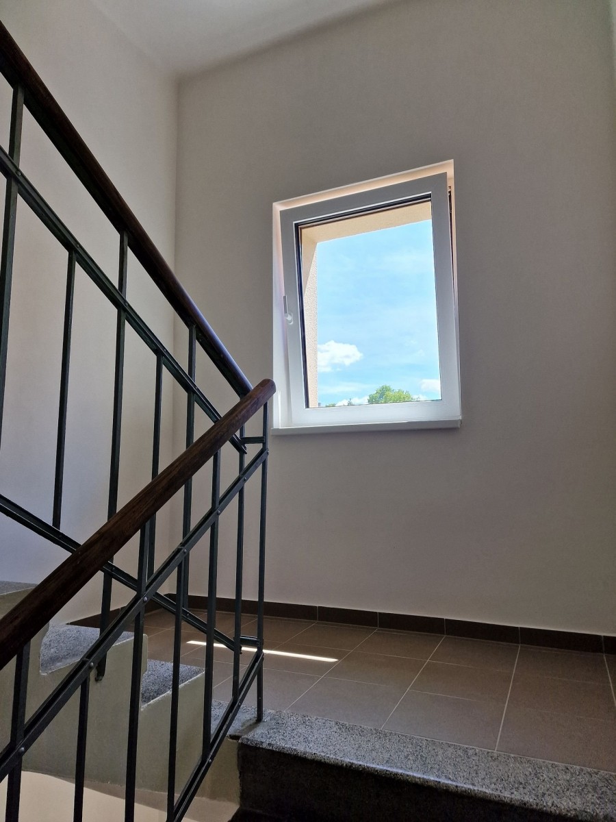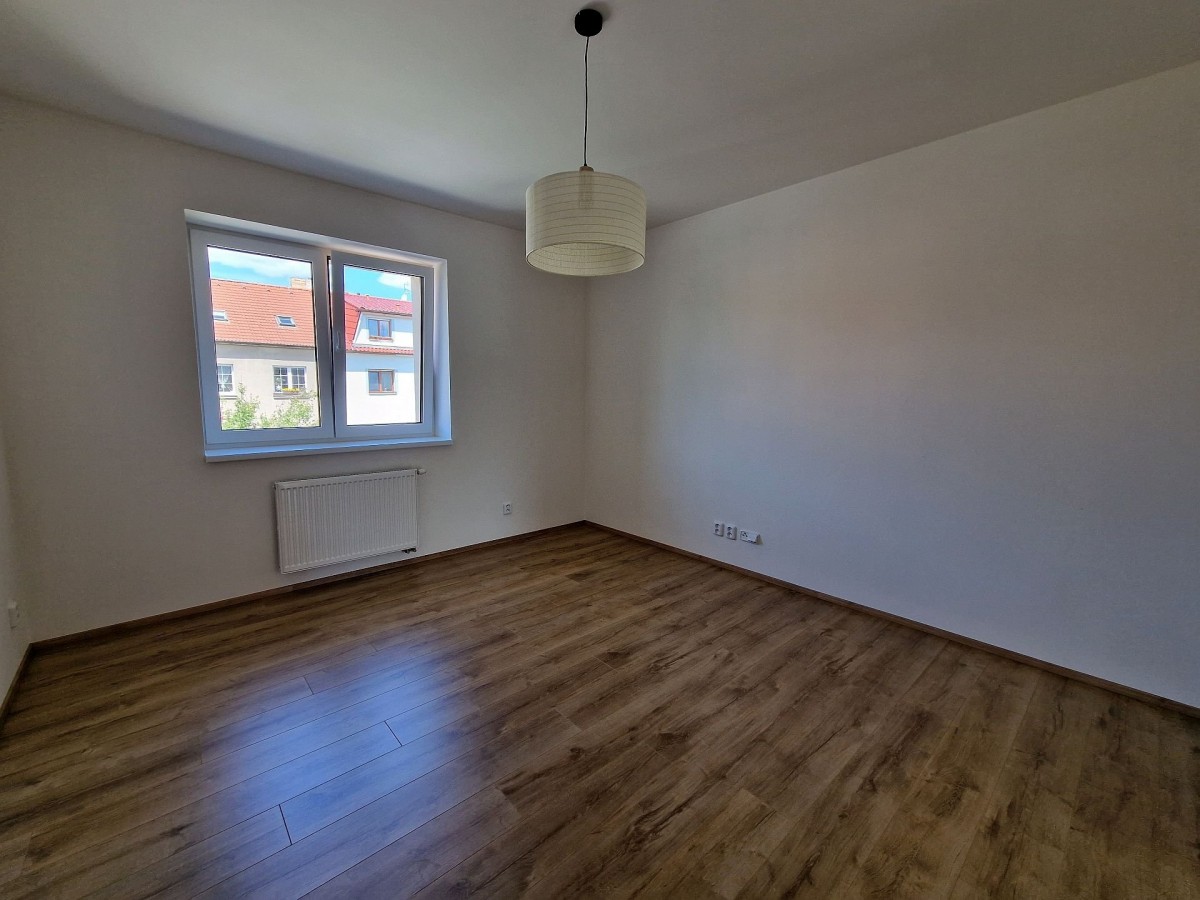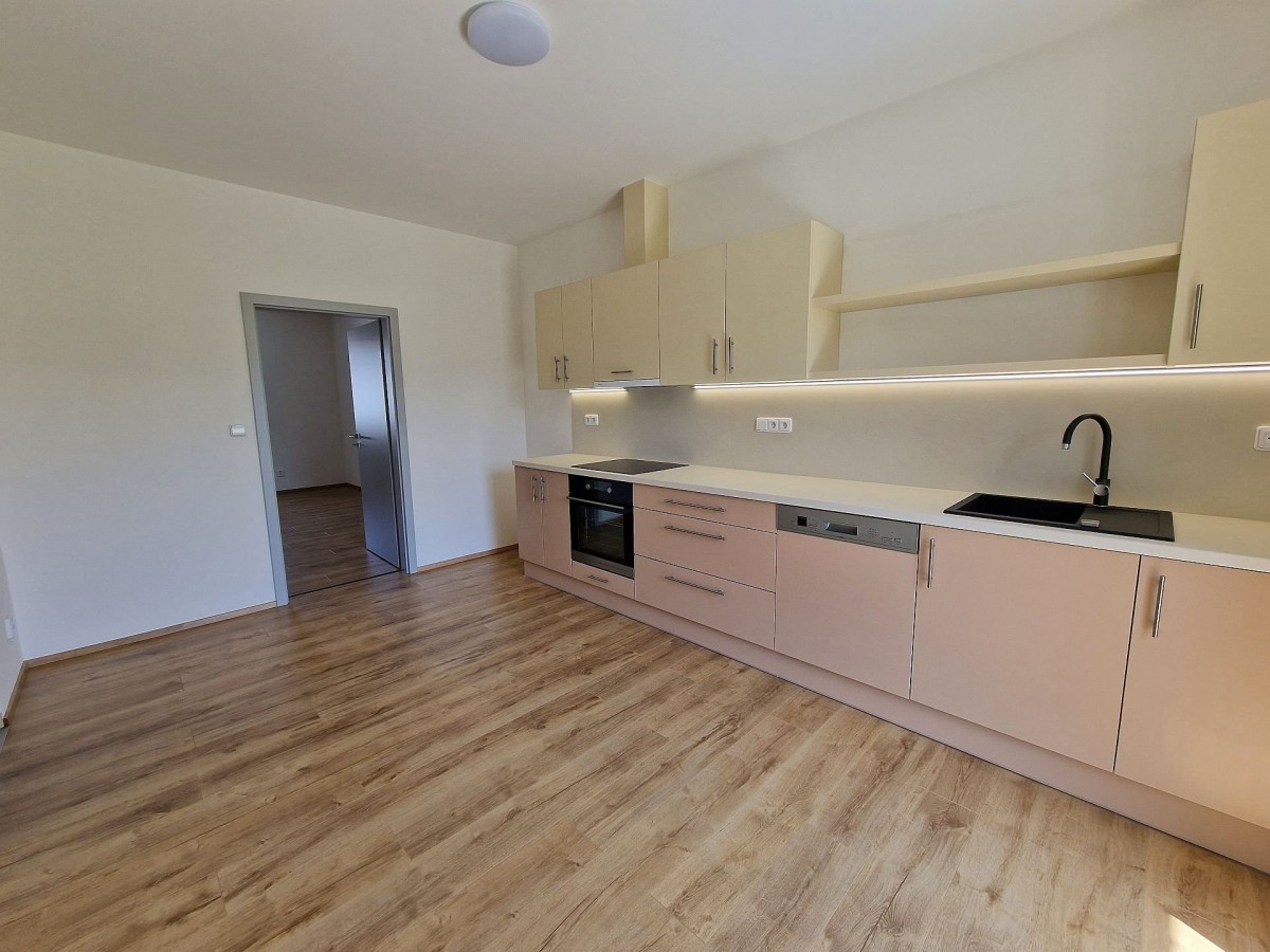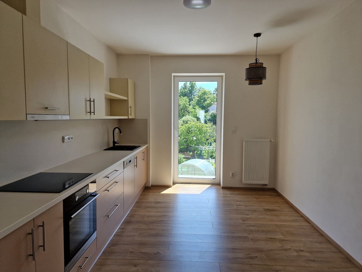Po vstupu do bytu Vás příjemně překvapí moderní a svěží design bytu. V kuchyni je nová kuchyňská linka, která je vybavena vestavěnými spotřebiči jako je elektrická varná deska, elektrická trouba, myčka na nádobí a digestoř. Předností této kuchyně je dostatek prostoru i pro jídelní kout. Obývací pokoj navazuje na kuchyň a tím nabízí praktické využití obytných prostor. Na zastřešeném balkóně o výměře cca 3 m2 s výhledem do zeleného vnitrobloku je možné trávit chvíle relaxace. Do ložnice se vstupuje samostatným vstupem z předsíně. V prostorné koupelně se sprchovým koutem a umyvadlem je příprava a místo pro umístění pračky. Na stěně je topný žebřík. Toaleta je samostatně. Ve vstupní hale je umístěna vestavěná skříň a je zde dostatek místa pro šatní věšák, zrcadlo atd. Zajímavostí je velice praktická, samostatná, zděná komora. V celém bytě jsou svítidla. Podlahu kryje laminátová plovoucí podlaha nebo dlažba.
