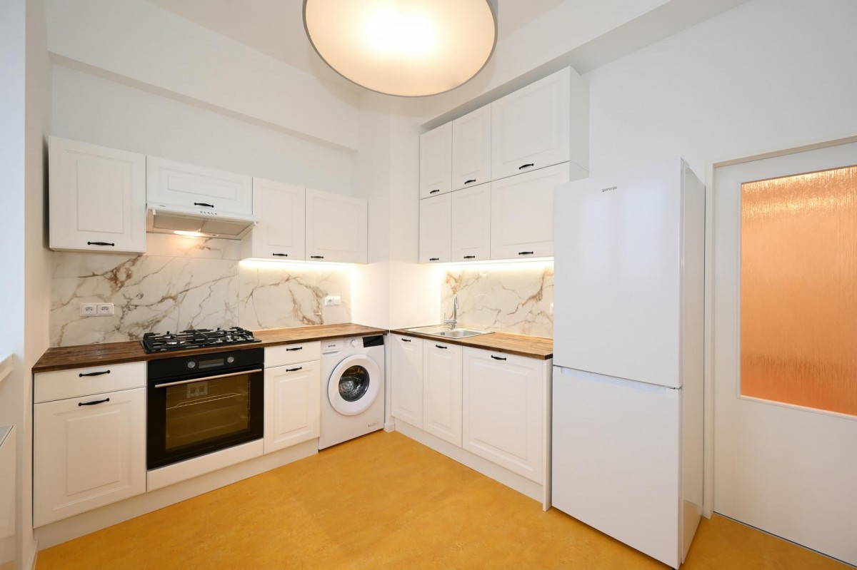 Atypický půdorys, 2+1, 2 ložnice, obývací pokoj / prostorná hala, kuchyň s veškerými novými spotřebiči - lednice s mrazákem, myčka, pračka, plynový sporák s troubou, digestoř. Krásná koupelna se sprchovým koutem, toaleta zvlášť. V části bytu renovované původní dubové parketová podlaha, kvalitní bezpečnostní dveře.