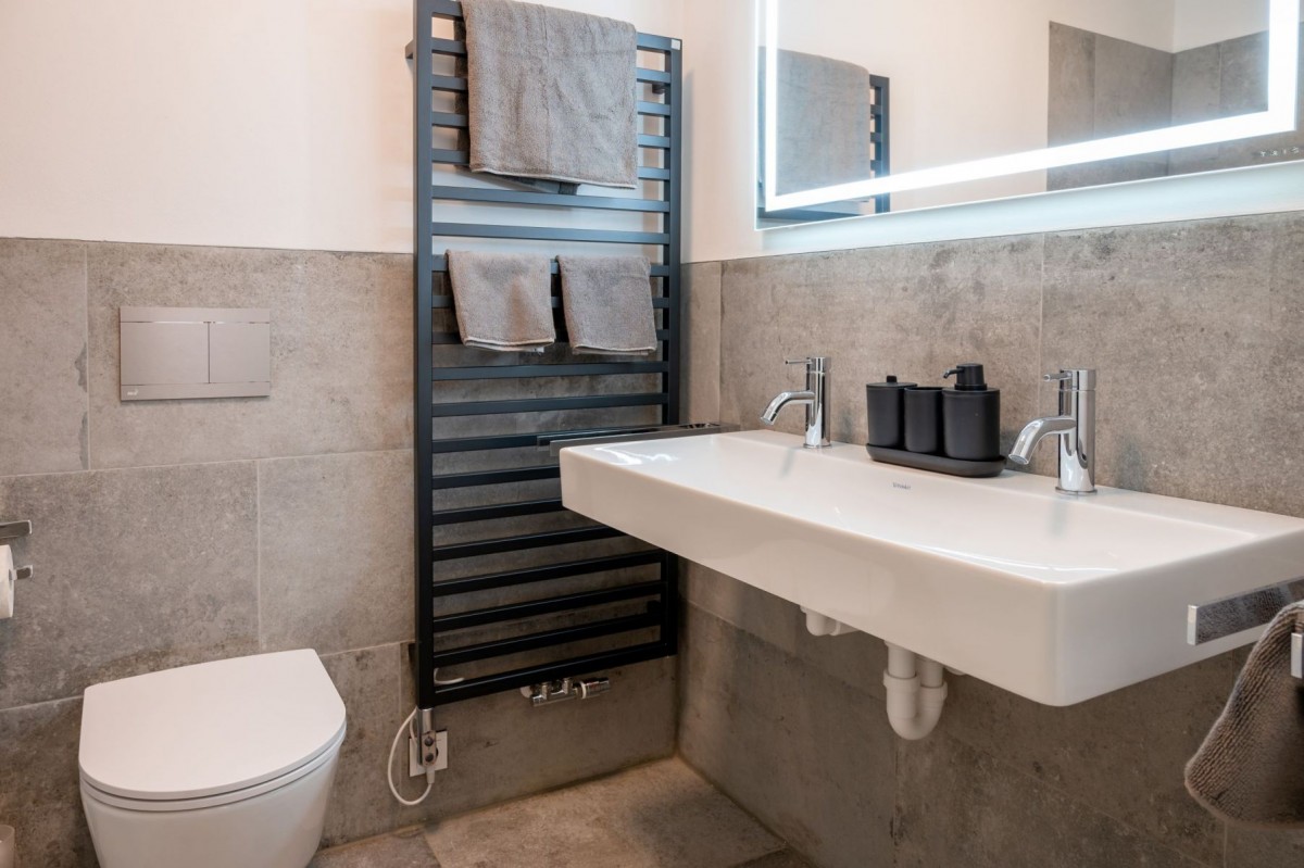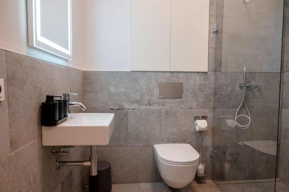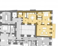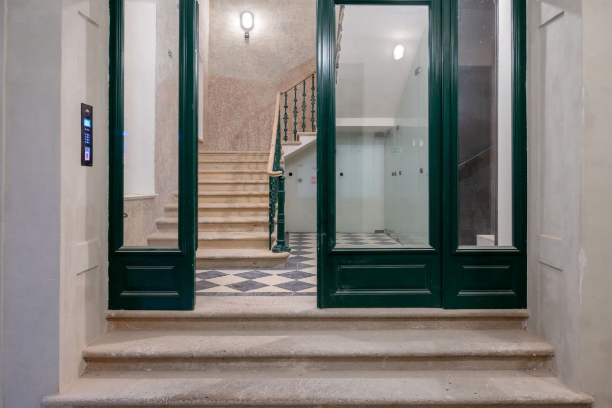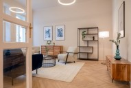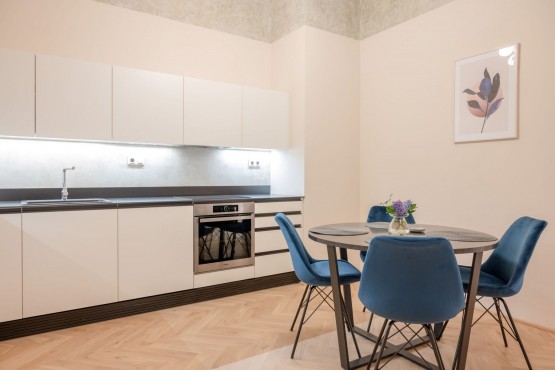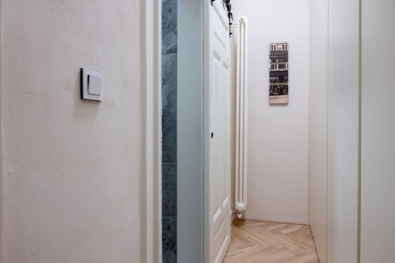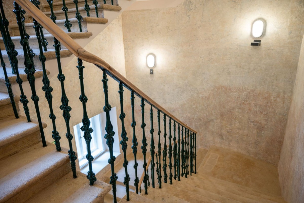 V interiérech, na společných chodbách i v bytě samotném, se podařilo obnovit původní vrstvy omítek a vznikla tak unikátní kombinace škrábaných omítek s těmi klasickými, což je charakteristický črt tohoto citlivě renovovaného domu. Historické prvky byly v maximální možné míře zachovány, doplněny moderními ladícími či kontrastními prvky, vše funguje v dokonalé symbióze a vytváří estetický zážitek.